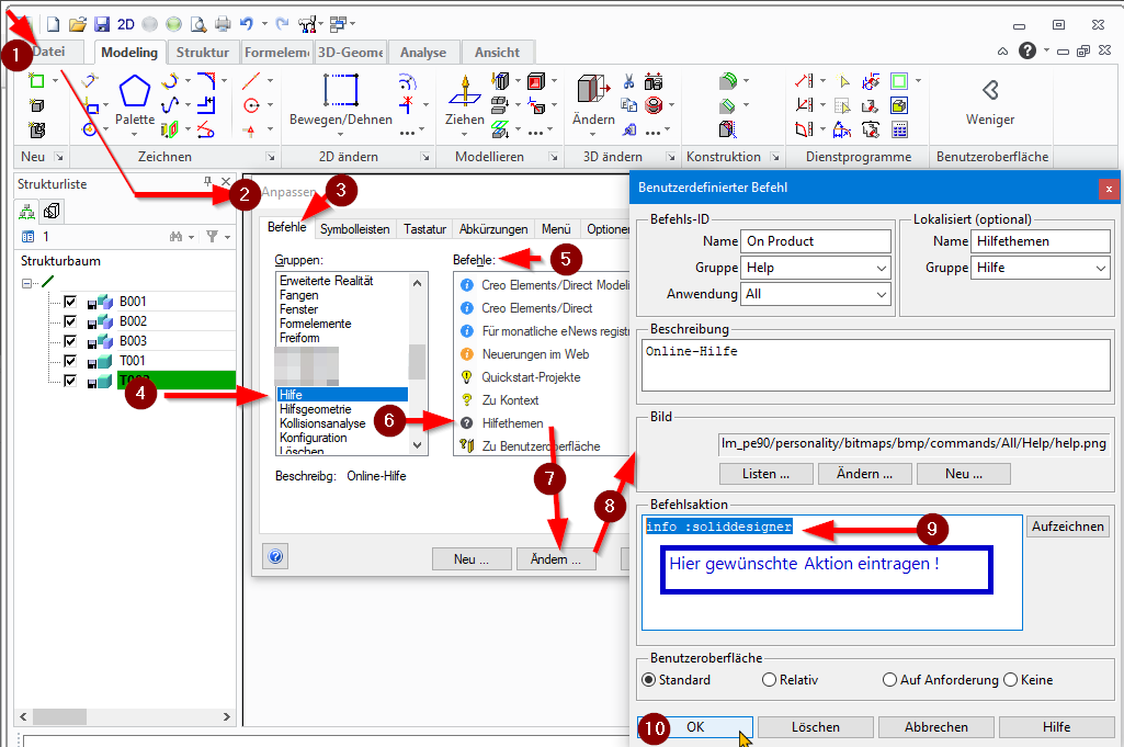 Aufgrund einer freundlichen Nachfrage ist mir jetzt noch eingefallen, das man die Änderung ja auch ganz nett über die Bedienoberfläche von Modelung durch führen kann. Also: => ➀ Datei -> ➁ Anpassen -> ➂ Reiter: "Befehle" -> ➃ Gruppe: "Hilfe" => ➄ Befehle: ➅ "Hilfethemen" => ➆ "Ändern" --->> ➇ Befehlsaktion: * statt: info :soliddesigner * ➈ dann: (oli::sd-display-url "https://support.ptc.com/help/creo/ced_modeling_express/r20.3.0.0/de/") => ➉ "Ok" => "Schliesen" -> dann vielleicht mal Modeling beenden und neustarten und gucken ob es geklappt hat.