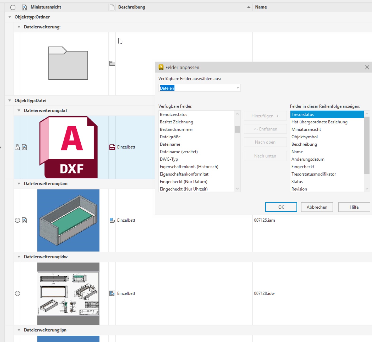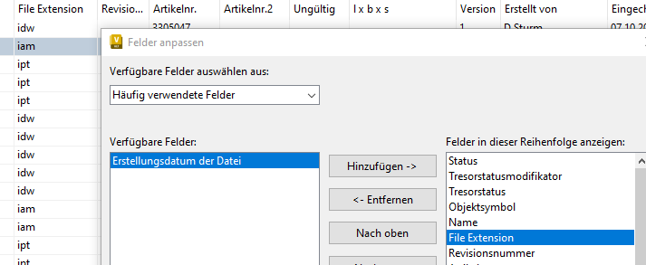 Hallo, ich denke du wirdt die Dateierweiterung nicht in der Liste finden, sie ist schon eingeblendet. Du hast die Gruppierung eingeschaltet und sie guppiert nach Objettyp und nach Dateierweiterung. RMT in der Kopfzeile, nach Feld gruppieren aufrufen, Dateierweiterung entfernen. Danach nach Feld gruppieren ausblenden wählen. Gruß Jürgen ------------------ Gruß Jürgen http://www.cad-verlag.de Eine Antwort auf diesen Beitrag verfassen (mit Zitat/Zitat des Beitrags) IP |