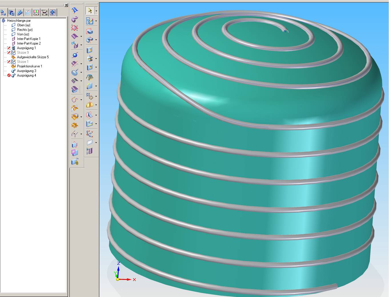 Tach, hab es mit Aufgewickelter Skizze und Projektionskurve hinbekommen. Jetzt hab ich aber schon das nächste Problem. Das ganze soll parametrisch aufgebaut sein, so dass ich z.b. die Heizschlange um 90 ° drehen kann. Werde mal schauen wie ich das hinbekomme und eure Tipps einfliessen lassen. Gruss BK