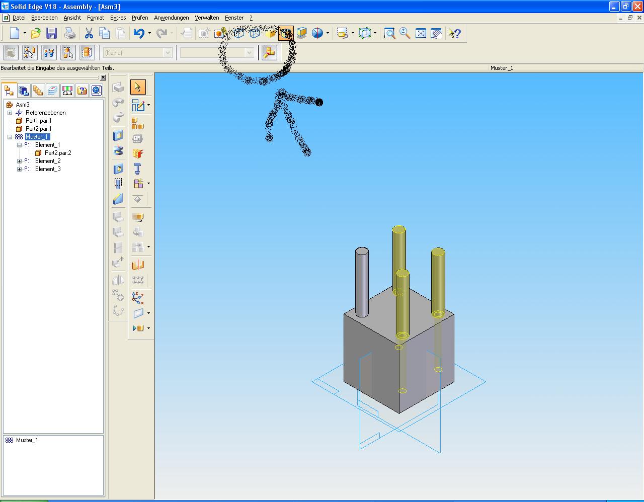 Hi Markus 1.In der Baugruppe erstellst Du auf einer Referenzebene eine Skizze 2.Dann in der Skizzenumgebung die Funktion Rechteckmuster (oder Kreismuster) wählen 3.In der Formatierungsleiste die Parameter eingeben (Elementabstand, Anzahl in X und Y usw.) 4.Mit der Maus Muster platzieren 5.Zurück 6.Fertigstellen Danach: 1.Funktion Muster von Teilen wählen. 2.Teil identifizieren, das in das Muster miteinbezogen werden soll 3.Skizze identifizieren, welches das Muster enthält 4.Muster in Skizze identifizieren (Skizze einfach noch einmal Klicken) 5.Fertig stellen Im Anhang noch ein Beschrieb aus CAD mit Solid Edge von Bernd Schmid, falls in der Baugruppe bereits ein Teil mit Muster vorhanden ist. Ich hoffe das hilft einen Schritt weiter und sonst nach dem Abendessen wieder Eine Antwort auf diesen Beitrag verfassen (mit Zitat/Zitat des Beitrags) IP |