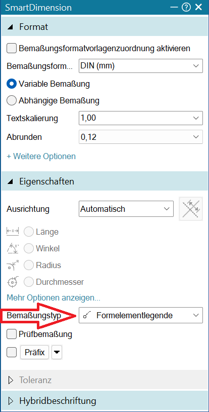 Der Trick ist, den Bemaßungstyp auf Formelementlegende umzustellen. Bemaßt man nun ein Formelement mit abrufbaren Informationen, also Bohrung oder Schlitz (Langloch), dann werden statt des Nennmaßes, die konfigurierten Werte abgerufen. Das sind nicht nur das Durchmesserzeichen, sondern z.B. auch Gewindegröße, Bohrtiefe, Bohrungsanzahl, uvm. Bemaßt man jedoch ganz normale Geometrie, dann wird die Bemaßung automatisch auf Nennmaß umgestellt. Man muß also nicht dauernd hin und herschalten, sondern kann dauerhaft mit dieser Einstellung arbeiten. ------------------ Gruß Markus Gras Unitec Informationssysteme GmbH Eine Antwort auf diesen Beitrag verfassen (mit Zitat/Zitat des Beitrags) IP |