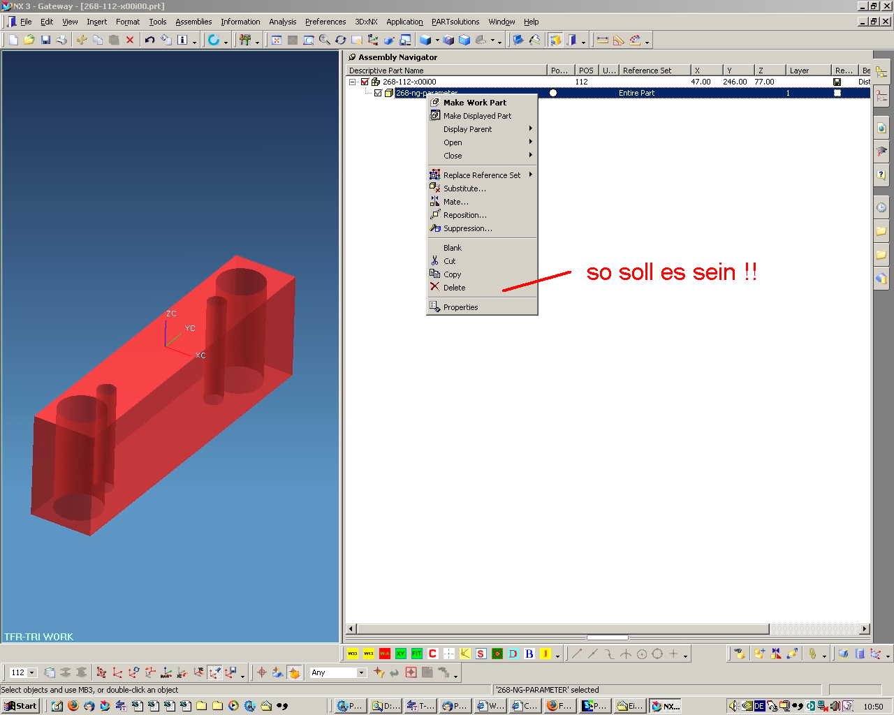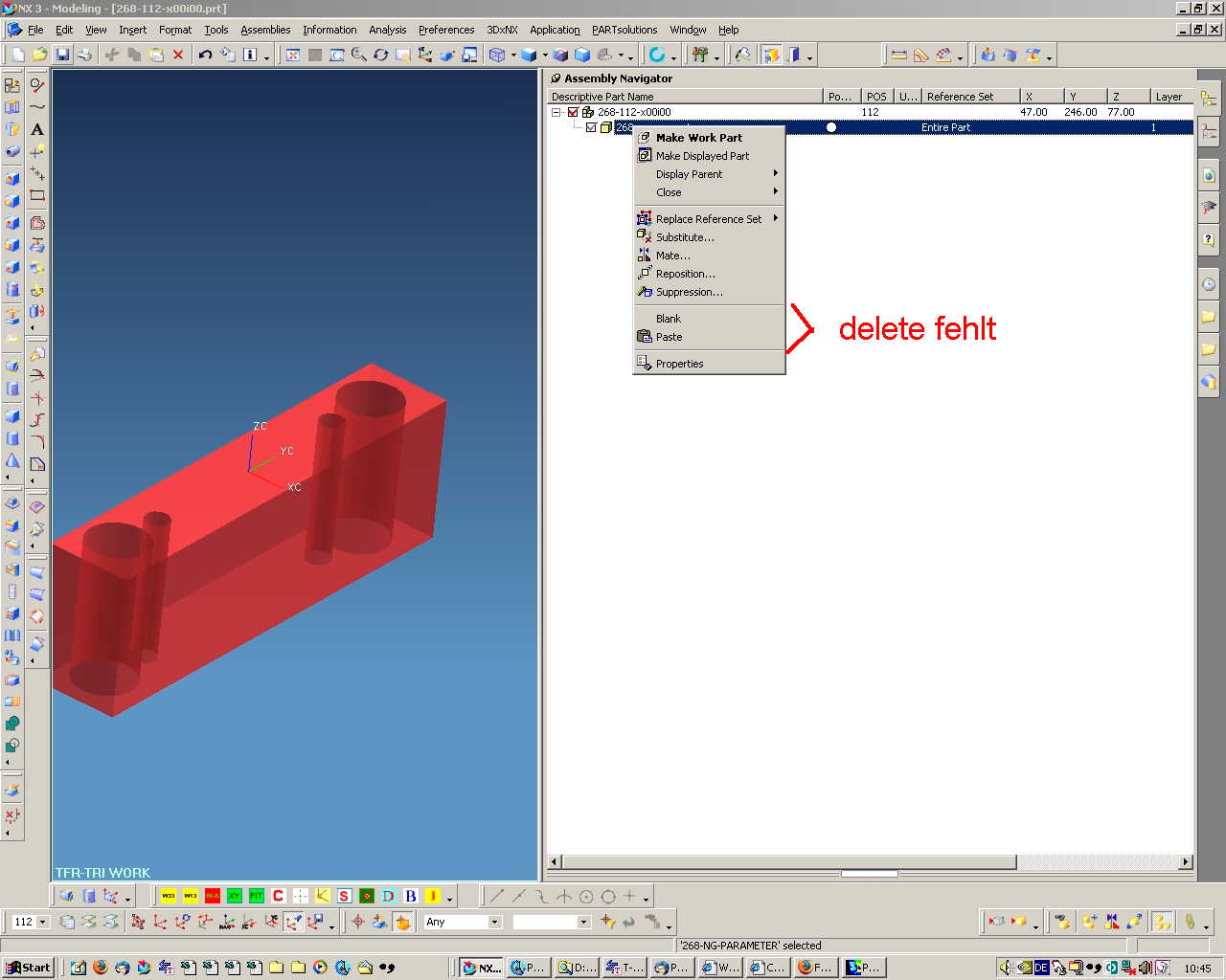 Da nicht reproduzierbar, ist dieser Bug laut UGS nicht existent. In der freien Wildbahn kennen ihn aber fast alle. (Zeitgleich dazu fehlen auch WorkPart/DisplayedPart im RadialPopUpMenue). Mein Workaround: Im ANT TopNode doppeklicken, dann gehts wieder. [Ursache ist, daß Markierungen an Komponenten "hängenbleiben"] Das fehlende Delete ist mir noch nie untergekommen, dafür vermisse ich regelmäßig das "OpenComponentAs" im Kontextmenue. Thomas Eine Antwort auf diesen Beitrag verfassen (mit Zitat/Zitat des Beitrags) IP |
