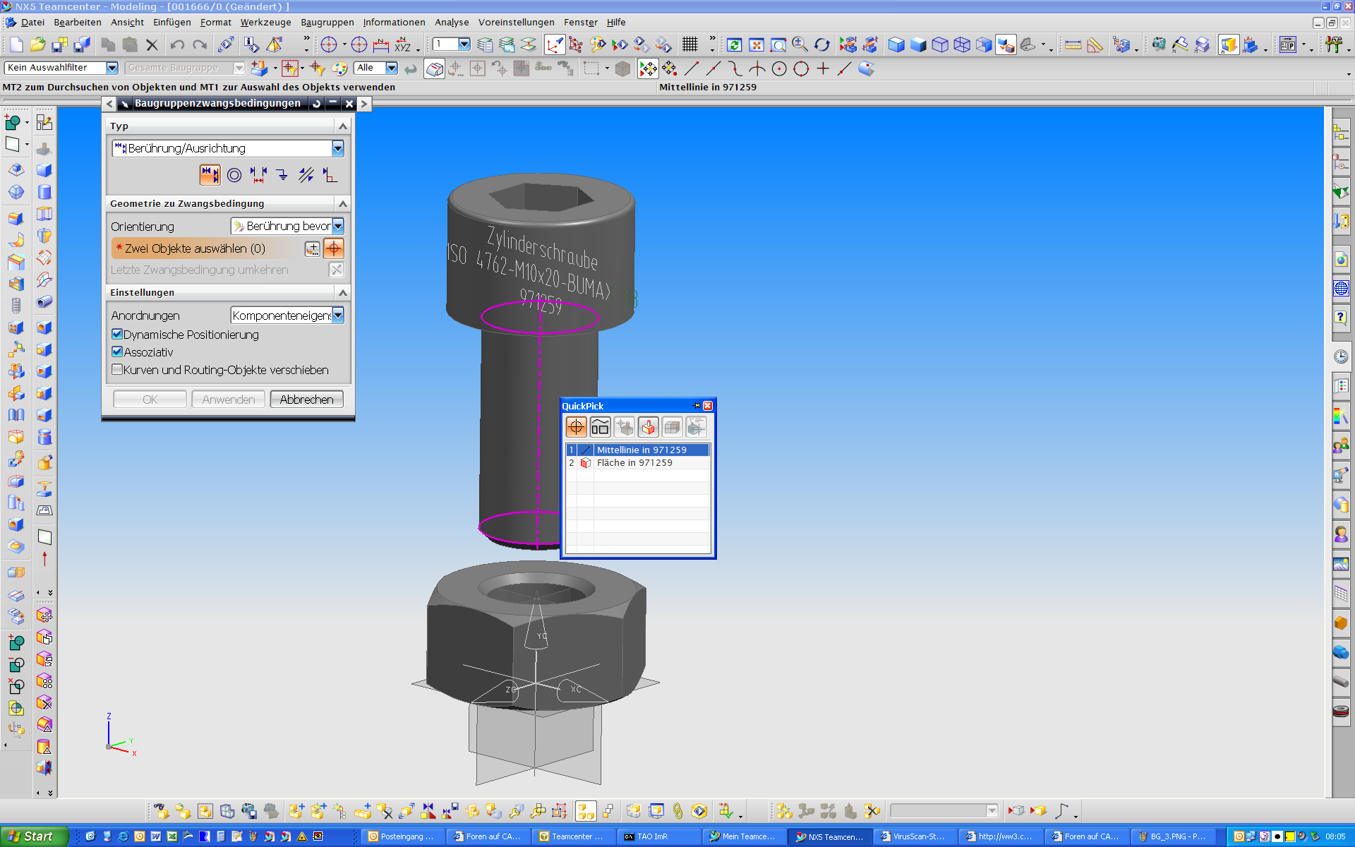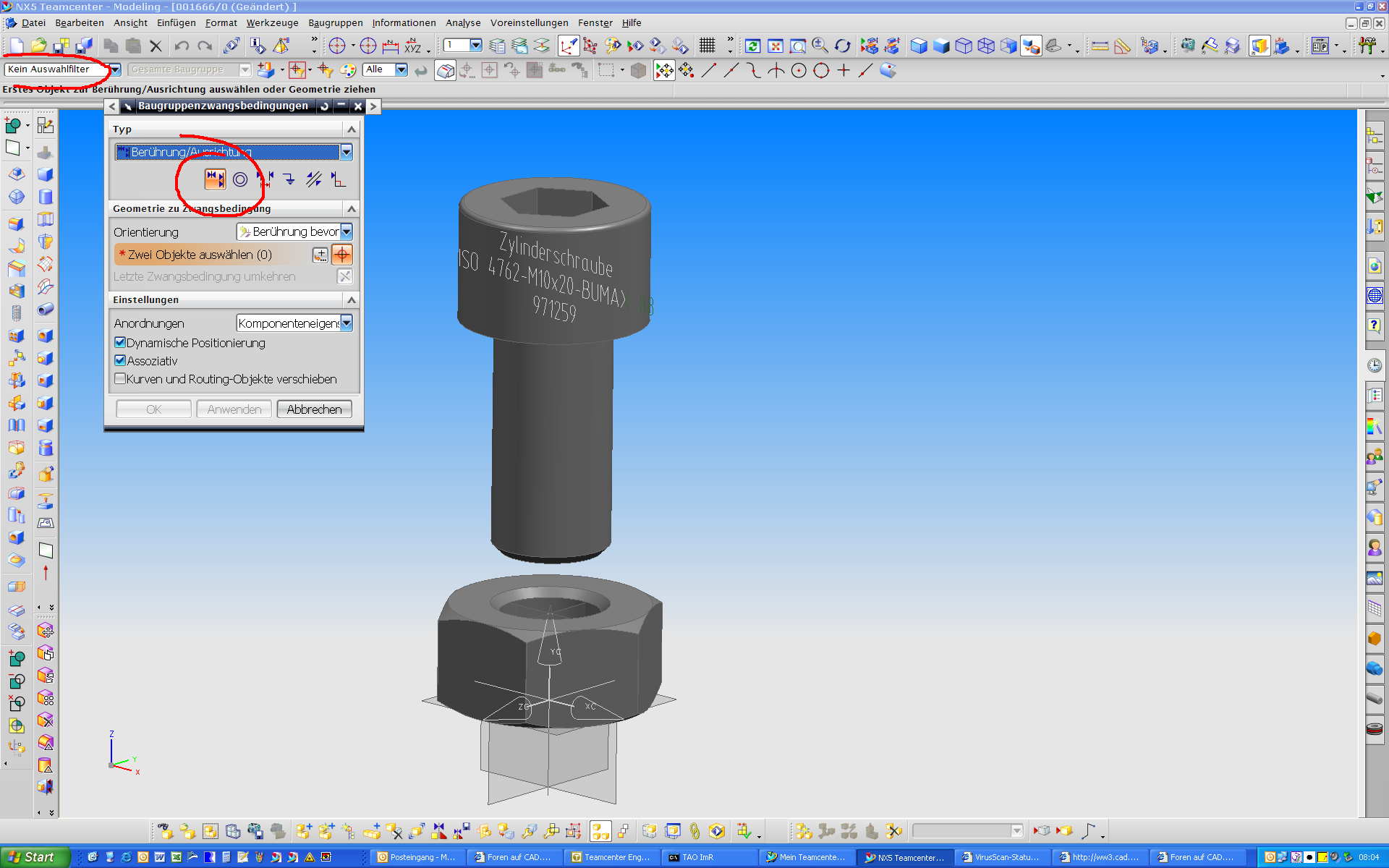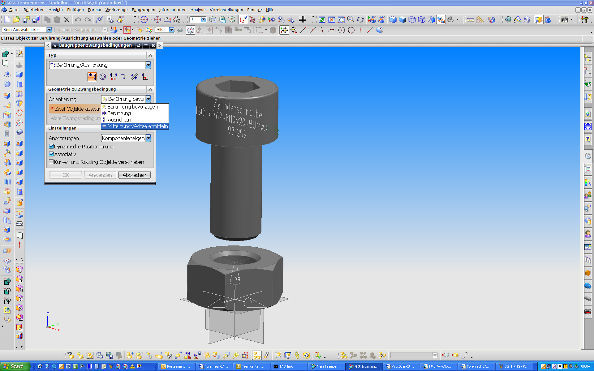 Hallo, jetzt habe ich nochmal nachgeschaut... Entgegen meiner ersten Aussage gibt es tatsächlich keinen Punkt 1 zu 1 bei der Positionierungszwangsbedingung "Mitte". Stattdessen wählst du "Berührung / Ausrichtung" danach bei "Orientierung" den Punkt "Mittelpunkt / Achse ermitteln". Danach den Auswahlfilter auf "Bezugsobjekte" umstellen, danach die beiden Achsen wählen, "Anwenden" drücken und fertig. ------------------ Gruß  Markus Eine Antwort auf diesen Beitrag verfassen (mit Zitat/Zitat des Beitrags) IP |