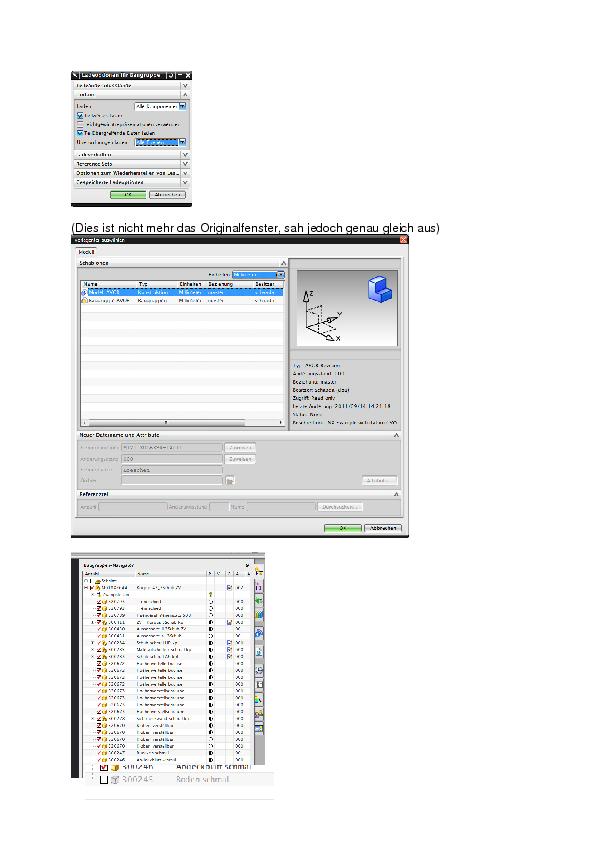 Hallo Ich habe im NX6 eine Baugruppe erstellt. Wenn ich jetzt im NX7.5 die Baugruppe öffnen will (Ladeoptionen für Baugruppe: Teilübergreifende Daten laden; alle Ebenen), öffnet sich ein Fenster (Vorlagenteil auswählen siehe Anhang). Dieses Fenster bezieht sich nur auf ein Teil der Baugruppe. Bestätige ich mit OK, funktioniert die Baugruppe einwandfrei. Öffne ich nun am nächsten Tag eine andere BG, in welcher das Teil, welches am Vortag abgefragt wurde auch enthalten ist, ist das besagte Teil nicht mehr sichtbar (Haken nicht gesetzt). Beim Setzten des Hakens erscheint die Fehlermeldung: - Teil ist keine gültige Version für Komponente - Diese Komponente kann nicht sichtbar gemacht werden. Es ist ein ausgeschossenes Reference Set. Ich kann das Teil löschen, will ich es jedoch erneut einfügen erscheint folgende Meldung: - Die folgenden Dateien konnten nicht geladen werden. Ursache für Fehler beim Öffnen: Teil ist keine gültige Version für Komponente Öffne ich die Baugruppe mit der Ladeoption: Teilübergreifende Daten laden; keine, ist das Teil ebenfalls nicht sichtbar, kann jedoch gelöscht und anschliessend korrekt erneut eingefügt werden. Wieso öffnet sich beim zuerst beschriebenen Öffnen der Baugruppe das Fenster (Vorlageteil auswählen), und was kann ich tun damit das besagte Teil nicht mühsam aus den Baugruppen gelöscht und erneut eingefügt werden muss?