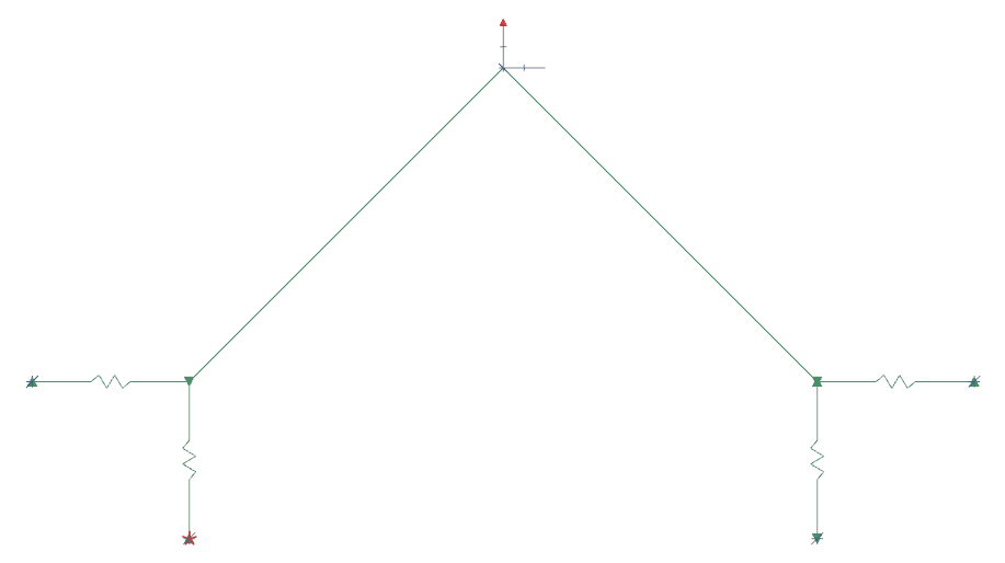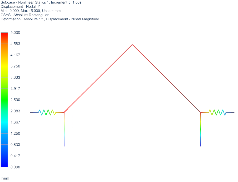 Nach viel Probieren, Recherchieren und F06-Dateien lesen bin ich jetzt am verzweifeln. Ich habe es geschafft ein Ergebnis zu erhalten, für eine nach oben (y-Richtung) wirkende Kraft (siehe Bild), und auch eine Kraft nach rechts (x-Richtung) hat funktioniert. Allerdings führt es zu Fehlern und Abbrüchen sobald ich verschieden große Steifigkeiten definiere, die Größe der Kraft ändere, die Steifigkeiten ändere, usw. Auch das Aktivieren der Option "Große Verschiebungen" führt zum Abbruch. Mit dem Solver 101 linear static war nichts zu machen. Mit dem Solver 402 multi-step nonlinear Kinematics bin schonmal weitergekommen, aber auch nicht ans Ziel.