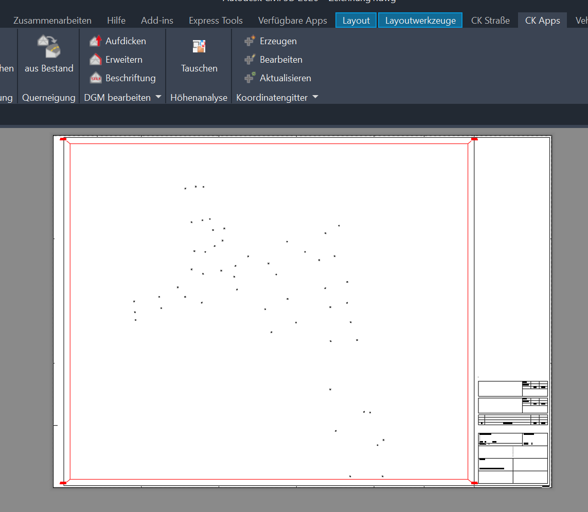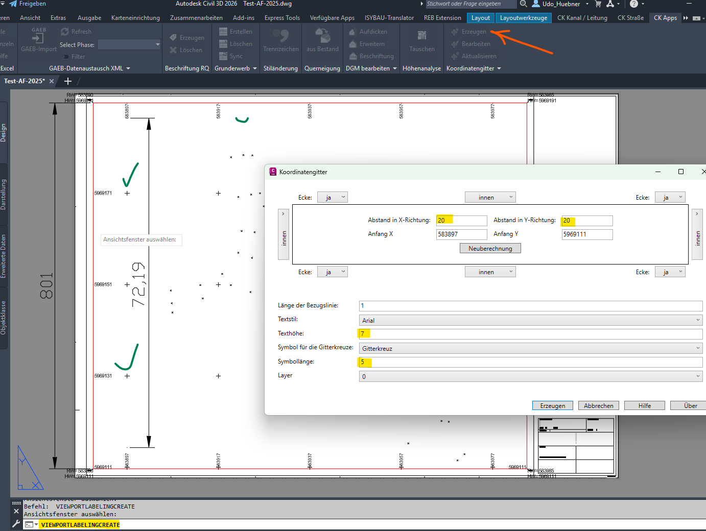 @kussi Folgende Möglichkeiten bestehen zum Erstellen von Koordinatengittern in Civil 3D 2026 mit CK DACH (seit 1 Woiche CK 2026.1 verfügbar!) und REB Extension a) LISP Makro aus der REB EXTENSION (Befehl: AFKOORD) oder b) die im DACH CK enthaltene Funktion zur Erzeigung von Koordinatengittern (Befehl: ViewportLabelingCreate) oder gar auch c) die MAP Funktion (Befehl: MAPLAYOUTREFERENCESYSTEM) Alle drei Befehle funktionieren in Civil 3D 2026.2 und CK DACH 2026.1 mit meinen Zeichnungen und auch mit deiner Zeichnung erwartet (geeignete Einstellungen vorausgesetzt). Ob es sich bei dir um einen Eingabefewler handelt, kann man ohne Screenshot der verwendeten Funktion/Einstellung nicht klären. ------------------ Mit freundlichem Gruß Udo Hübner www.CAD-Huebner.de