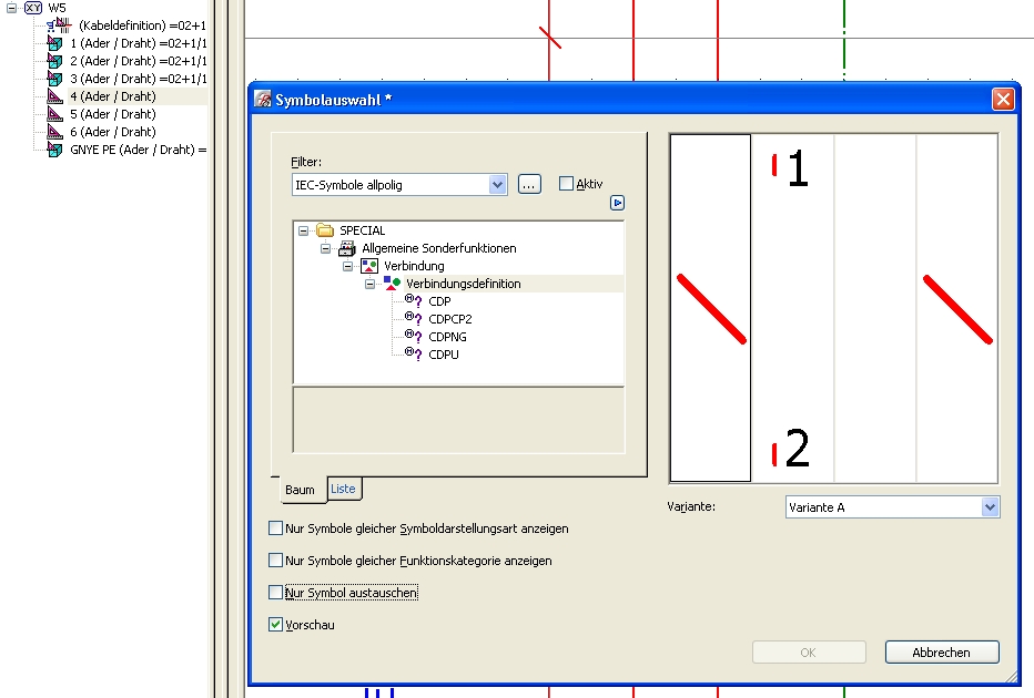 @Nairolf Ja diesen Beitrag habe ich jetzt gesehen...danke für den Hinweis. ABER: Funzt irgendwie nicht so ganz... mit der Backspace Taste geht dann die Auswahl auf, aber die Symbole für den VDP hat genau 4 Einträge. (oder sollte es mehr haben??) siehe Bild 1 (Filter habe ich mal alle weggeschaltet) Wenn ich das ganze im Projekt anpassen will, ist das genau gleich... siehe Bild 2 Was ich machen möchte: Egal ob ich Automatisch, Händisch, oder aus dem Navi per drag+drop ein Kabel erzeuge, es sollte auf jeden Fall überall gleich aussehen. Entweder kurzer Schrägstrich, oder querstrich. Bei mir ist das jetzt entweder/oder...komisch nicht? @Fredy: danke für den Hinweis... Gruss aus Bern