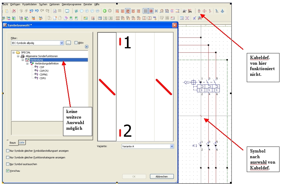 OK, nun habe ich mir definitv was kaputt gemacht...  oder ich find einfach nicht mehr zurück. was habe ich gemacht: Wollte dem guten Rat von div. Forumusern umsetzen, und bei einer gezeichneten Kabeldefinitionslinie das Symbol austauschen und mir ansehen wie das kommt. Kabeldefinition auswählen, Backspace drücken und dort das Symbol <4 / CABDL> austauschen. Filter raus und dann unter ALLGEMEINE SONDERFUNKTIONEN/VERBINDUNG/VERBINDUNGSDEFINITION das Symbol <CDP 308> gewählt. Tja, nach diesem Schritt habe ich doch tatsächlich das Schräge Symbol am Zeiger, aber wenn ich es platziere geht ein Dialog auf EIGENSCHAFT (SCHALTZEICHEN)welcher Leer ist. Einfach ein graues Fenster ohne jegliche Eintragungen, geschweige denn BMK Vorschlag vom Kabel, wie das sonst üblich ist. Nicht so toll dacht ich mir, und wollte wieder zurück wechseln auf <4 / CABDL> aber leider kann ich das gar nicht mehr auswählen, da ALLGEMEINE SONDERFUNKTIONEN/VERBINDUNG/VERBINDUNGSDEFINITION nicht geändert werden kann. (ich habe alle Filter ausgeschaltet, an dem kann es nicht liegen) Irgendwer eine Idee? Cheers Tom
