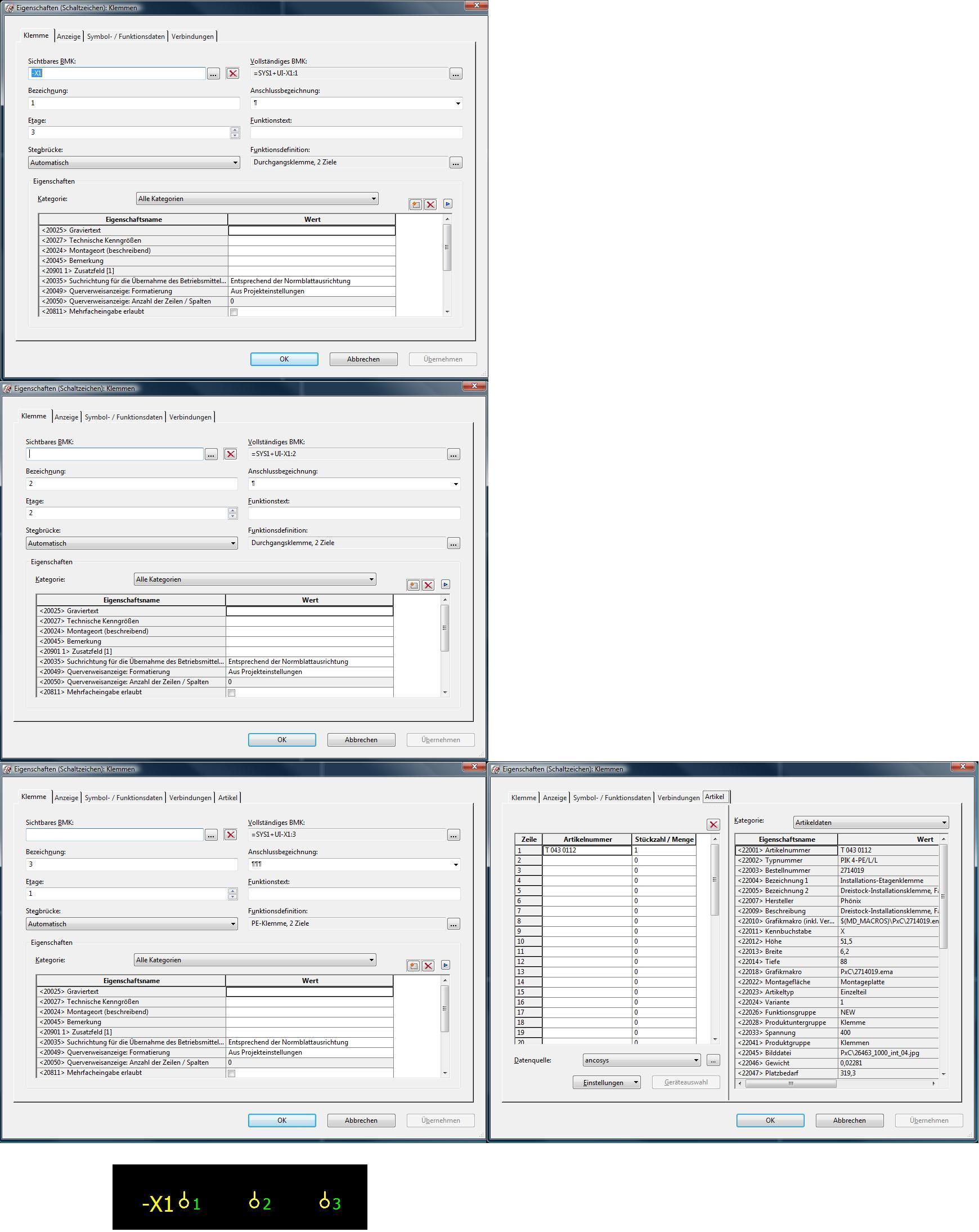 Guten morgen! Ich verwende Dreistockklemmen von Phönix Typ: ST 2,5-PE/L/L Die oberste Klemme hat die Bezeichnung -X1:1 Die mittlere Klemme -X1:2 Die untere PE-Klemme -X1:3 (Der Kunde wollte das so) Wenn ich jetzt bei dieser Klemme die Ebenen vergebe erkennt EPLAN diese nicht als eine Dreistockklemme. Ist ja auch klar haben ja alle eine andere Bezeichnung. Gibt es trotzdem eine Möglichkeit diese drei Klemmen als eine Dreistockklemme zu definieren? Oder wie kann ich diese drei Klemmen unter einem Stück einer Artikelnummer zusammenfassen? FG Ingo Eine Antwort auf diesen Beitrag verfassen (mit Zitat/Zitat des Beitrags) IP |