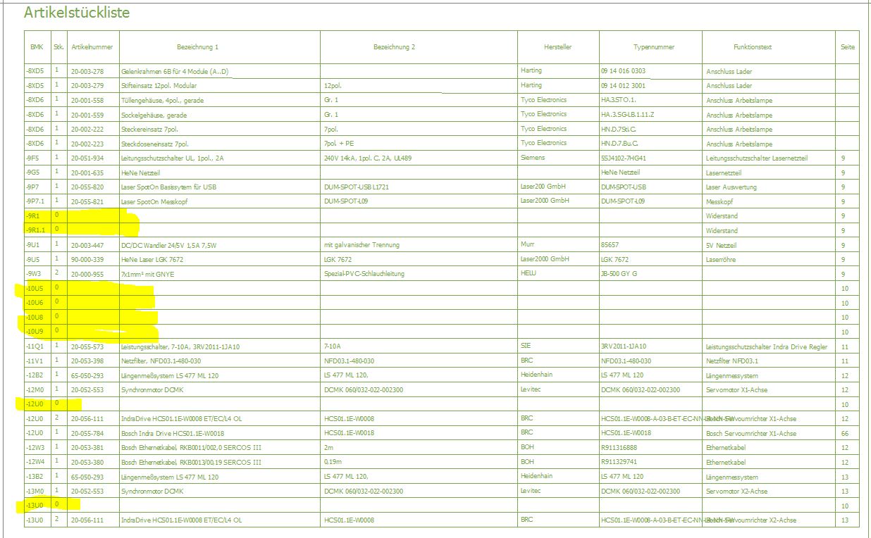 Moin  ! Ich habe eine Frage zu der Auswertung der Artikelstückliste.! Soweit funktioniert alles, jedoch habe ich hin und wieder einige "Leichen" BMKs in der Artikelstückliste (siehe Anhang). 1. Ein Problem ist, das zb. diese 10U5 - 10U9 eigentlich Grafiken sind aber trotzdem aufgeführt werden. 2. 12U0 ist einmal als Gerätekasten Allpolig vorhanden und ein Artikel ist hinterlegt. Ein zweites mal taucht dieser Artikel natürlich in dem Schaltschrankaufbau auf...deshalb werden hier im Anhang als Stückzahl 2 angezeigt..jedoch soll dieses BMK logischerweise nur einmal vorkommen. Und eine Zeile davor steht wieder 12U0 mit Stückzahl 0??!? Irgendwas mache ich da falsch Könnt ihr mir da weiterhelfen? Gruß Eine Antwort auf diesen Beitrag verfassen (mit Zitat/Zitat des Beitrags) IP |