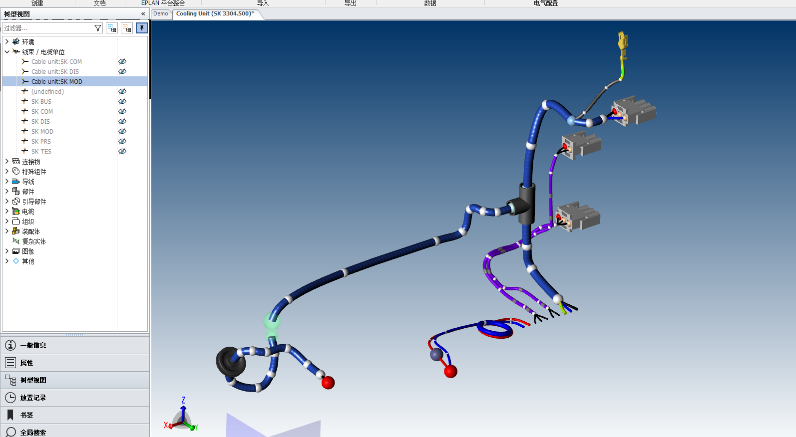 Der Kabelbaum wird offiziell wie folgt beschrieben: Ein Kabelbaum ist die Anordnung und Kombination von Leitern, Kabeln und anderen Komponenten (Klemmen, Stifte usw.). Die Kabel werden zu einem Kabelbaum gebündelt, beispielsweise mit Klammern, Kabelbindern usw., und auf Sonderarbeitsplätzen oder Nagelbrettern zusammengefügt und festklemmt, um einen Kabelbaum zu bilden. Eine Kabeleinheit ist die Anordnung und Kombination von Leitern und Kabeln (normalerweise mit Zweigen), die in einem Kombinationsverhältnis stehen oder in eine Gummimanschette oder Kunststoffmanschette eingebunden sind und an die Schaltung angeschlossen werden können. Eine Kabeleinheit ist in der Regel einfacher und kompakter als ein Kabelbaum. Den Unterschied zwischen beiden können wir an der Schrankklimaanlage im Demo-Projekt erkennen. Dies ist die Darstellung der Kabeleinheit SK MOD. [Diese Nachricht wurde von daodao1997 am 11. Jan. 2026 editiert.] Eine Antwort auf diesen Beitrag verfassen (mit Zitat/Zitat des Beitrags) IP |