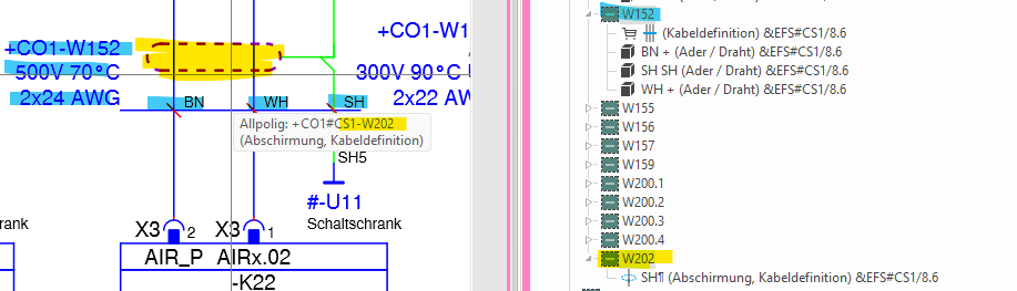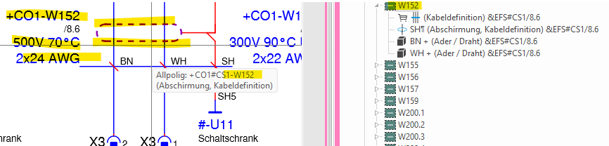 ich habe ein Problem das ich leider nicht lösen kann. Ich habe eine geschirmte Leitung (nur gezeichnet ohne Artikel) die sich aufgrund unserer Einstellungen (grün) darstellen sollte. Was nur passiert wenn ich über der Kabeldefinition den Schirm anders benenne als das Kabel selbst (siehe Anhang). Sobald beide die gleiche BMK haben nimmt er die Färbung (Potenzial) raus.