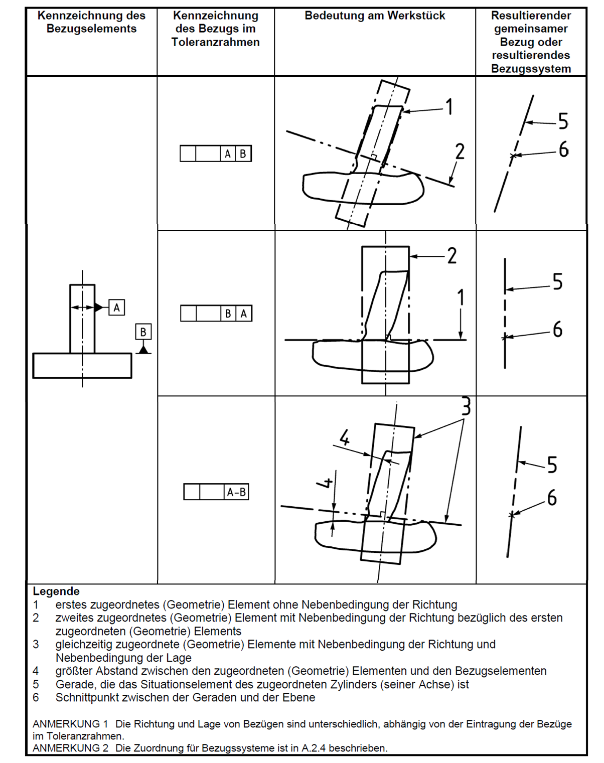 Hier liegst Du mE falsch. Die Situationselemente von gemeinsamen Bezügen haben alle Randbedingungen der Richtung und des Ortes zueinander. Das bedeutet hier bei "B-C", dass die Achse B in der Ebene C liegt. Die Anpassung der Bezugselemente erfolgt so, dass diese Randbedingungen erfüllt sind. Ich stelle es mir (hier bei innenliegenden Geometrien) so vor, dass der Zylinder bei B und das Parallelebenenpaar bei C simultan aufgeblasen werden bis diese Elemente maximal groß sind UND das Bauteil sich nicht mehr bewegen lässt UND der maximale Abstand zwischen Bezuselementen und Bauteilgeometrie minimal ist. Bei den Beispielen in der Norm, Tabelle 6, mit zwei nominal parallelen Zylindern ist es genauso: Beim gemeinsamen Bezug werden die Zylinder gleichzeitig assoziiert und haben den theoretisch exakten Abstand zueinander. Zitat: ...die Klammern braucht es nur wenn danach eine komplementäre Angabe kommt, die auf beide Elemente des gemeinsamen Bezugs angewendet wird (ISO 5459 / 7.4.2.9)