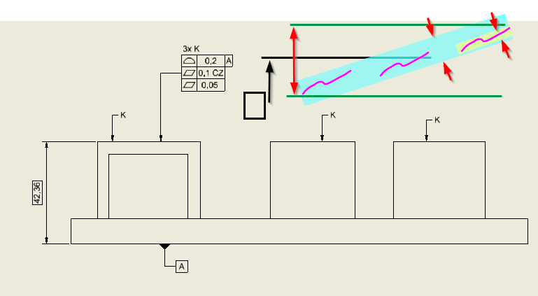 Die Zahlenwerte habe ich natürlich erfunden. Wichtig ist aber, dass sie von oben nach unten absteigend sind. Das Profil begrenzt ja auch die maximal mögliche Ebenheit... Die "K" halte ich für optional und sollen sicherstellen, welche drei Flächen gemeint sind. Kann und sollte man auf das reduzieren, was wirklich gebraucht wird. Im einfachsten Fall das Profil ohne Ebenheiten. Dann müsste man aber auch damit klar kommen, dass z.B. die mittlere Fläche um den Toleranzwert tiefer liegt als die äußeren beiden. Derartige Themen werden durch die zusätzlichen Anforderungen begrenzt. Im Bild rechts oben der Versuch, die Toleranzzonen an einem Beispiel zu skizzieren. Pinke Linien die erfassten Punkte der Flächen K; schwarz die nominale Geometrie mit dem richtigen Abstand zu A, symmetrisch dazu die Toleranzzone für das Profil (grüne Linien); hellblau die gemeinsame Zone über die drei Elemente; hellgelb die Zone der Ebenheit eines Elementes; rote Pfeile sollend die jeweilige Toleranzzonenbreite andeuten. Die Zonen für die Ebenheiten haben im Allgemeinen eine unterschiedliche Orientierung (weil keine Randbedingung, frei im Raum drehbar). ------------------ Gruß KraBBy Eine Antwort auf diesen Beitrag verfassen (mit Zitat/Zitat des Beitrags) IP |