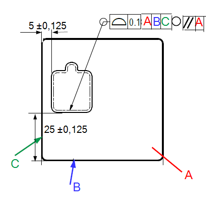 Moin Karsten, wenn ich die Problematik richtig verstehe, soll die Kontur in sich "genau" sein (0,1) und gleichzeitig könnte man mit einer "gröberen" Position (0,25) zu B und C leben. Meine Idee: die Position zu A | B | C wie von Dir vorgeschlagen angeben, jedoch mit den 0,25 mm Toleranz. Zusätzlich darunter die Anforderung [ "Position" | 0,1 CZ | A ] ebenfalls rundum für alle Flächen des Durchbruchs. Das ergibt mE eine "schwimmende Toleranzzone", also der dünne Streifen mit 0,1 ist innerhalb des breiteren mit 0,25 frei verschieb- u. drehbar. ------------------ Gruß KraBBy Eine Antwort auf diesen Beitrag verfassen (mit Zitat/Zitat des Beitrags) IP |