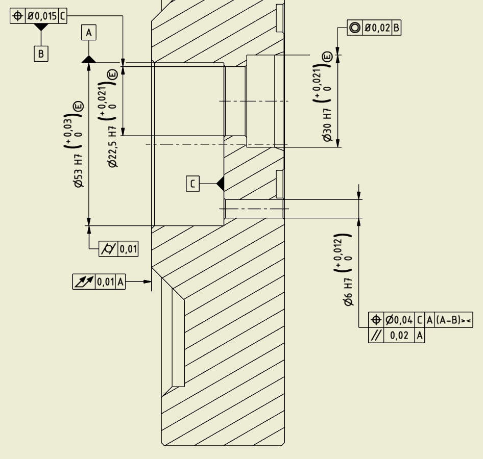 Hallo Community,kann man die Form- und Lagetolerierung so machen? Hauptsächlich geht es um die Positionstoleranz der Bohrung 6H7. In die Bohrung d53H7 kommt ein Gegenstück mit Übermaß und Zapfen mit Übergangspassung, der in die Bohrung d22,5 ragt.
