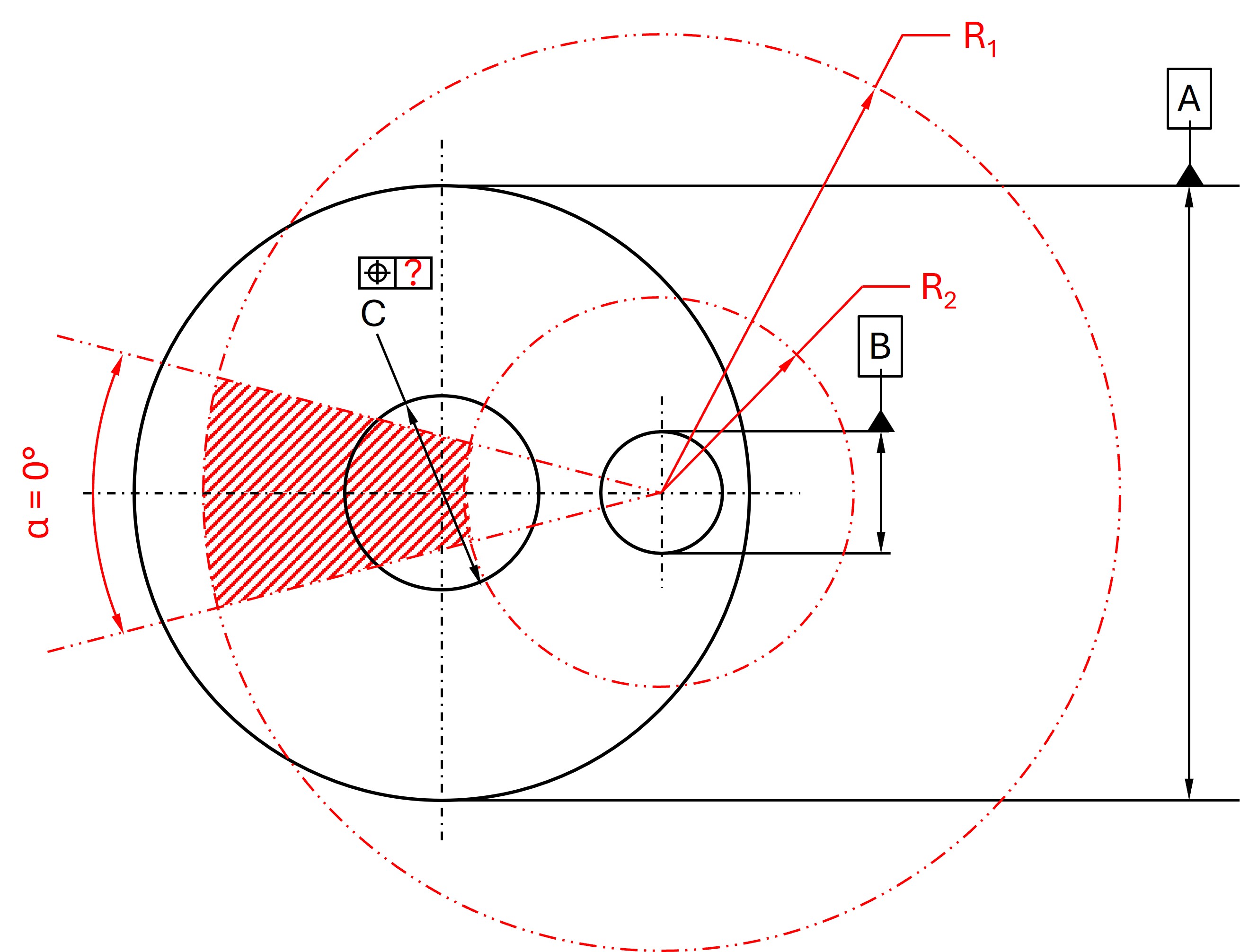 Zitat: Original erstellt von yodaspider: Hallo,ich möchte folgenden Sachverhalt in einer Zeichnung darstellen. Es sei eine Scheibe "A". Diese hat eine Bohrung "B", die nicht in der Mitte liegt. Theoretisch exakt in der Mitte der Scheibe liegt die Bohrung "C". Diese Bohrung C darf innerhallb einer Toleranzzone liegen, welche die Form eines Ringsegmentes hat. Gibt es eine Möglchkeit der Darstellung? Besten Dank