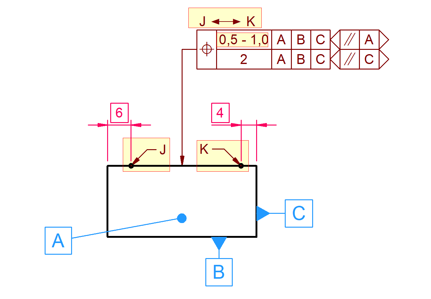 Wichti ist, dass Du die Positionen des Verlaufs (jeder Buchstabe möglich, aber J und K werden auch in der Literatur oft genommen) über TED Maße spezifizierst Die beiden Felder mit zwei Orientierungsebenen ergeben dann eine trapezförmige Toleranzzone - in diesem Beispiel - der Größe 2mm und von 0,5 auf 1mm
