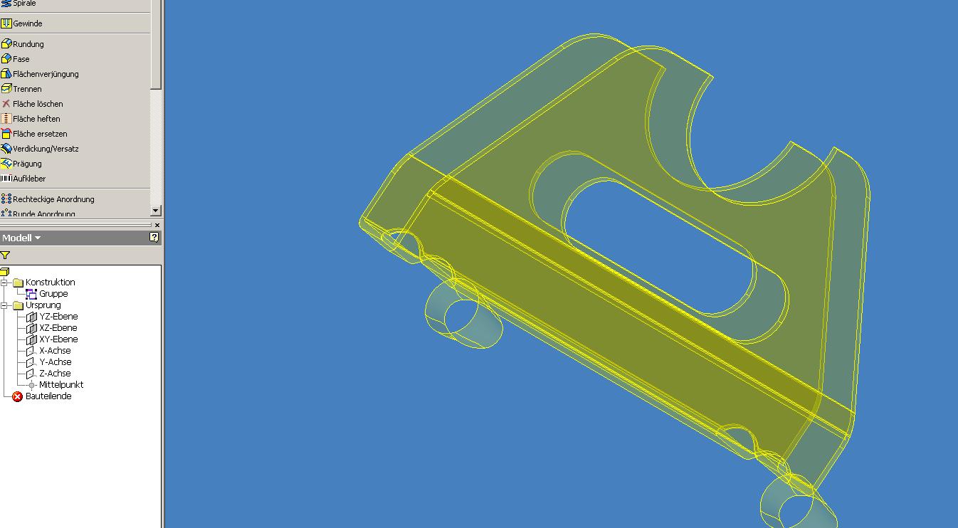 Hallo Alex, die Flächen sind noch in der Konstruktionsumgebung. Vermutlich konnte IV die nicht automatisch heften und verschieben. Die Flächen schauen auch nicht sauber aus. Mein Tipp "Mit Rhino die Flächen sauber bearbeiten und Prüfen und dann in Inventor einlesen". Das Programm gibts zum testen (Einschränkung "es kann nur 25x gespeichert werden). www.flexicad.de Gruss Bernd
