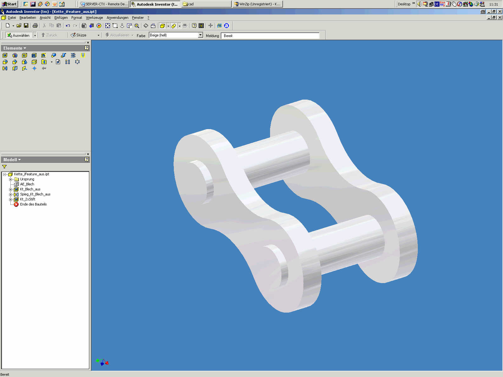 iFeatures kenne ich eigentlich nur als Konstruktionselemente, die ich auf ein Teil anwende, um mehrere Arbeitsschritte zu sparen bzw. Fehlerquellen zu vermeiden. Wenn Sie auf so eine Kette wie im Bild hinauswollen, dann IPTs erstellen, Baugruppen machen und dann Kette zusammenbauen oder so wie ich im Bild etwas tricksen, damit der Rechner nicht zu sehr leidet. Eine Antwort auf diesen Beitrag verfassen (mit Zitat/Zitat des Beitrags) IP |