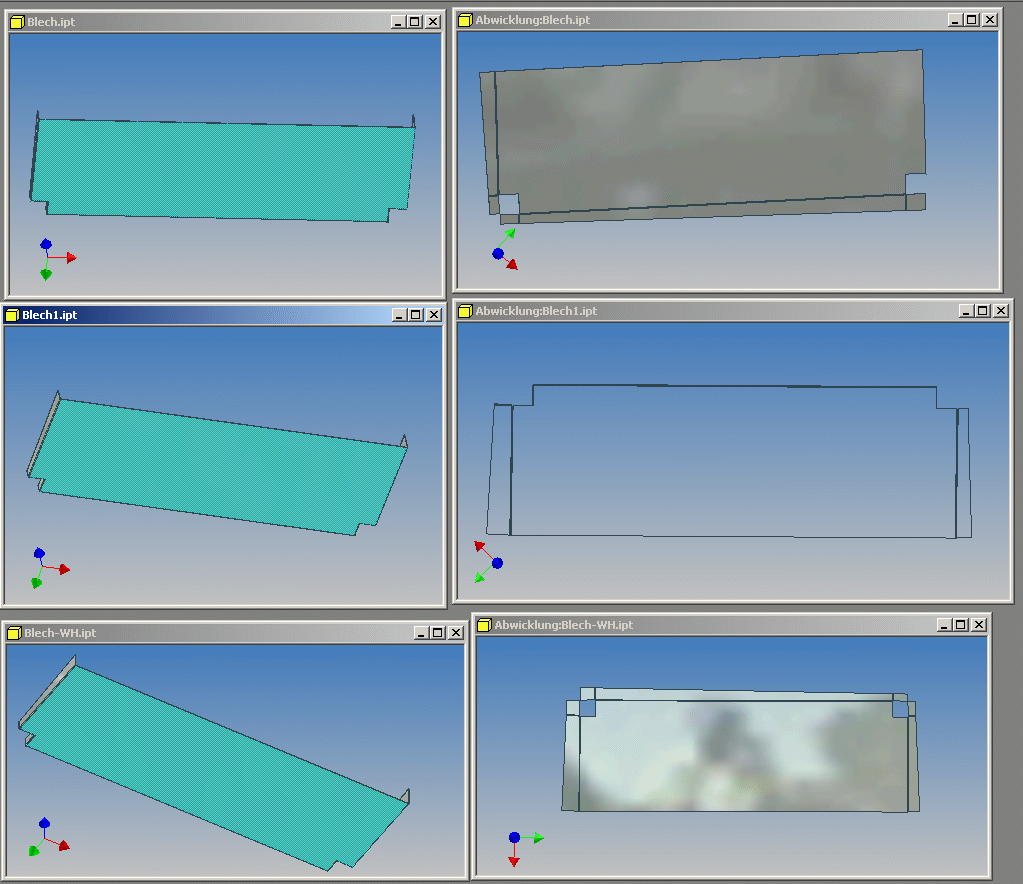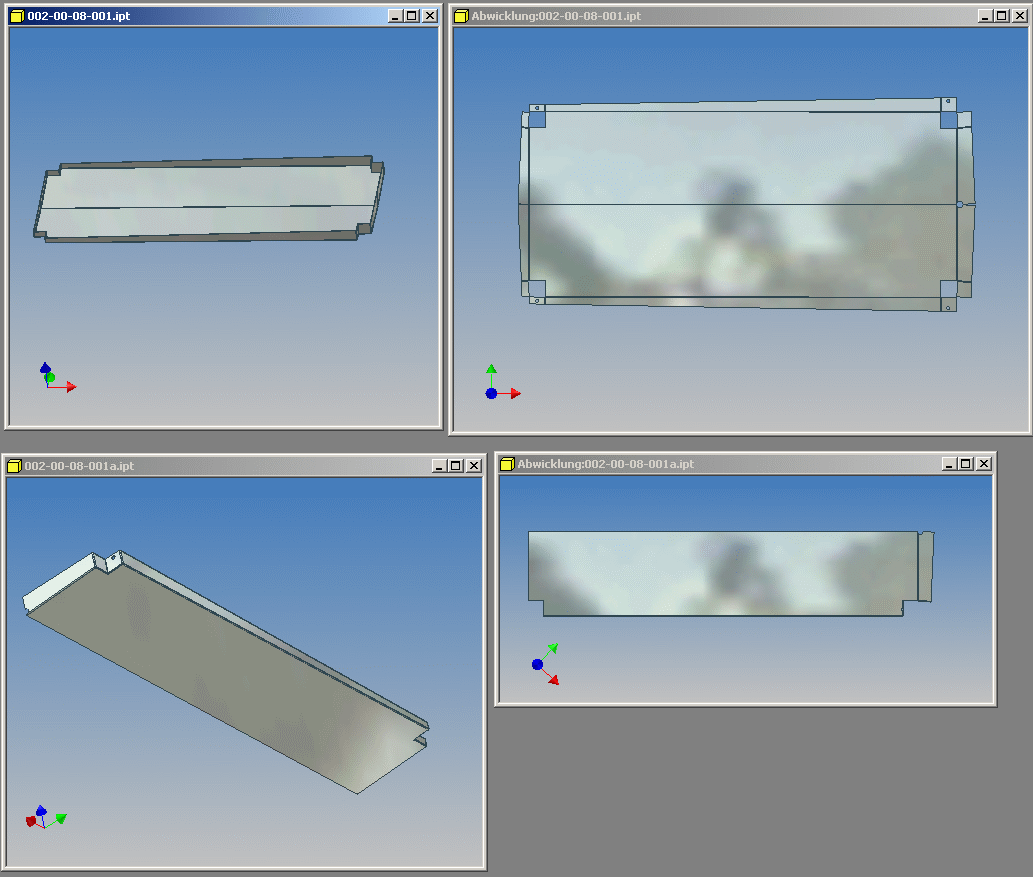 Hallo W. Holzwarth, Hallo Mathias, nachdem ich die vermeindliche Lösung von W. Holzwarth erhalten hatte wunderte ich mich, warum bei seiner Datei die Abwicklung funktioniert und bei meiner nicht, obwohl meine Ecken alle entsprechend freigeschnitten waren. Interessanterweise konnte ich W. Holzwarth seine Datei nicht neu abwickeln nach dem ich im Browser die Abwicklung gelöscht hatte. Da ich zusätzlich zu meinem PC auch noch ein Notebook habe, auf dem allerdings zur Zeit nur der IV6 installiert ist, habe ich auf dem Gerät versucht die Abwicklungen zu erzeugen. Es funktionierte ohne Probleme. Auch auf meienm PC funktioniert es mit IV6. Eine Neuinstallation vom IV7 brachte keinen Erfolg. So habe ich das Kantblech mit dem Inventor 6 auf meinem Notebook konstruiert. Denn dort funktioniert das Abwickeln. Da ich immer bestrebt bin die gleiche Arbeit mölglichst nicht doppelt zu machen, hatte ich bereits bei den ersten Versuchen nur eine Hälfte des Bleches konstruiert. Diese Hälfte finden ihr in der Anlage unter "002-00-08-001a.ipt". Eigendlich wollte ich in dieser Datei die zweite Hälfte der Bleches durch Spiegeln hinzufügen, doch da gab es ein neues Problem. Die Komponente "Wandstärke" läßt sich nicht spiegeln. Was blieb mir anderes übrig, als ein neues Teil zu erzeugen und das halbe Blech als "Abgeleitete Komponente" einzufügen um es dann zu spiegeln und als ganzes Teil abzuwickeln. Das hat problemlos geklappt (siehe "002-00-08-001.ipt"). Nun habe ich mit meinen PC weiter gearbeitet. Da ich immer noch nicht glauben kann, daß die Sache mit dem Abwickeln nur auf meinem PC nicht funktioniert, habe ich das nun komplette Blech (002-00-08-001.ipt) versucht mit meinem PC abzuwickeln. Es funktioniert, auch wenn ich die von Notebook noch vorhandenen Abwicklung zuvor lösche. Versuche ich aber das halbe Blech (002-00-08-001a.ipt) auf meinem PC abzuwickeln, streikt der Inventor 7 wie gehabt. Es wäre interessant zu erfahren, ob es Rechner mit IV7 gibt, bei denen sich die Sache genauso verhält, oder ob es nur an meinem PC mit dem IV7 dieses Problem auftritt. Gruß Stefan Eine Antwort auf diesen Beitrag verfassen (mit Zitat/Zitat des Beitrags) IP |