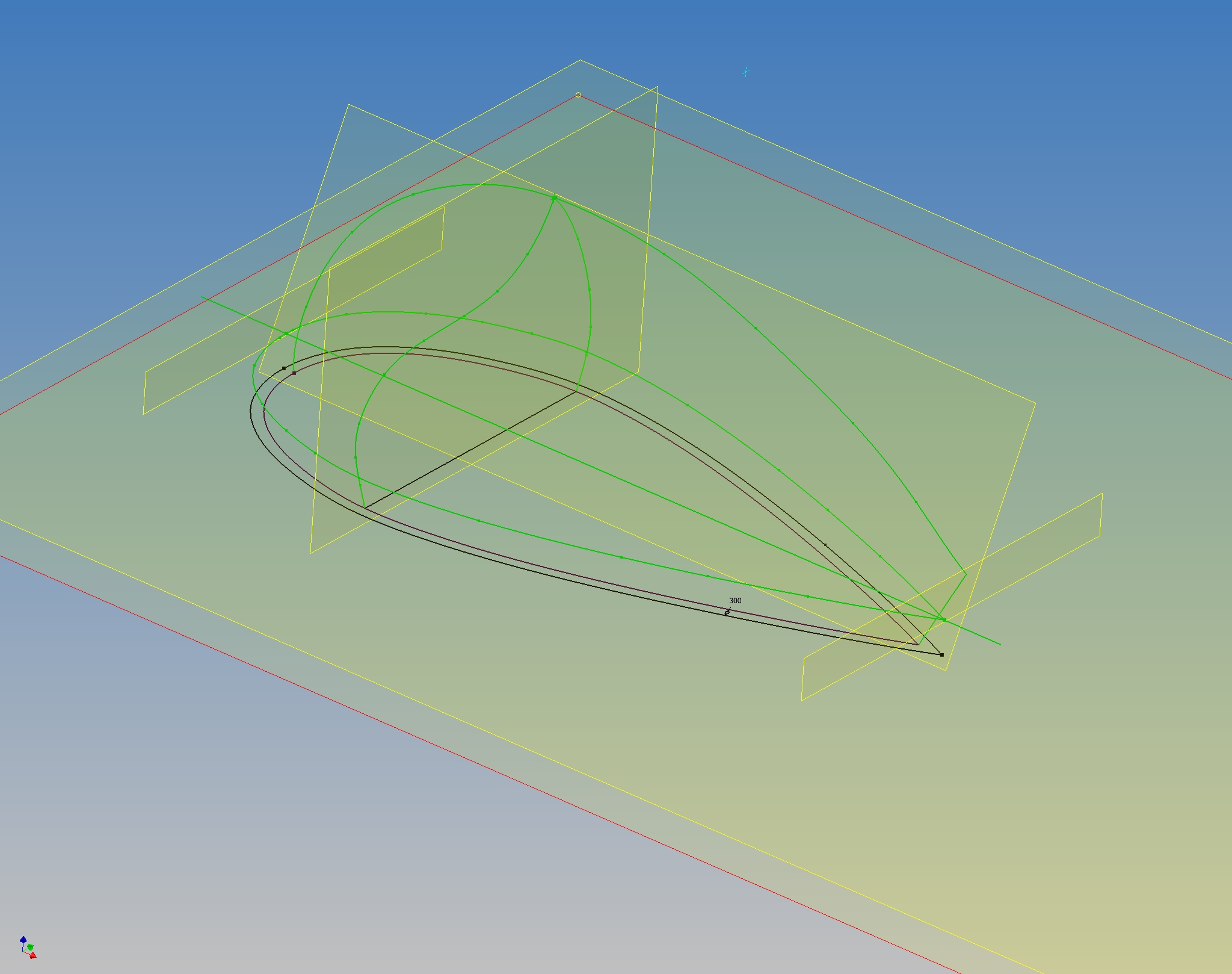Hi Andre! Für den Befehl Erhebung brauchst Du Profile (=Spanten) und kannst Leitkurven (=Stringer) verwenden. Die Spanten kannst Du beliebig im Raum liegen haben. Die Stringer (wenn Du welche einsetzt) müssen Knotenpunkte mit den Spanten haben. Das paßt bei Dir nicht. Und jeder Stringer sollte in einer eigenen Skizze liegen. Sonst eckt es ziemlich bei der Zuweisung. Stell Dir vor, Du baust den Fischkörper aus Sperrholzprofilen und Balsaplanken auf, dann hast Du die richtige Vorgangsweise im Kopf .