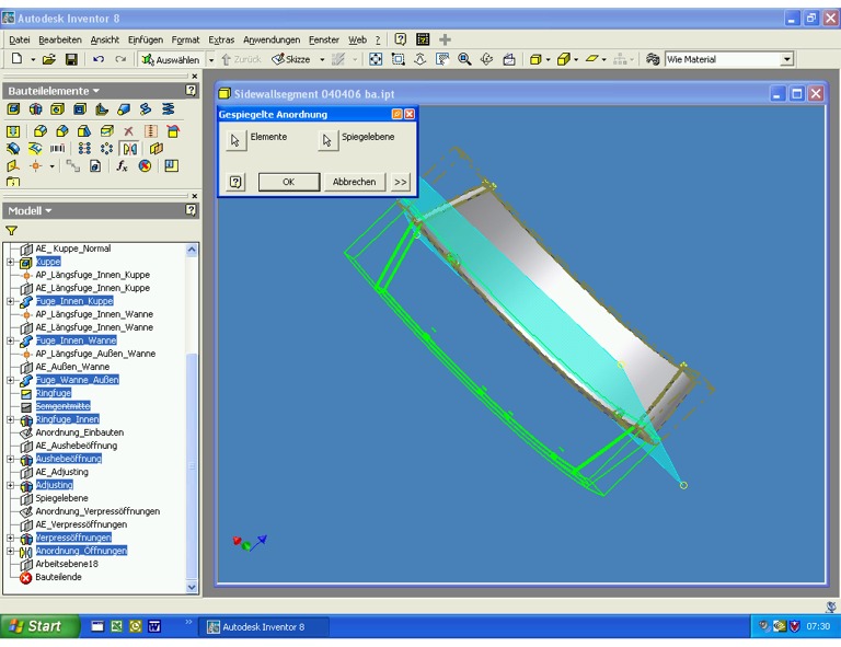 irgendwie check ichs nicht?!.... das was auf dem screenshot zu sehen ist ist ja das basisteil oder? ich versteh den zusammen hang mit bauteil-spiegeln nicht. oder willst du eigendlich ein "feature" innerhalt des bauteils spielgen? das ist ja was anderes... wenn du ein feature spiegelst das aber noch von einem trennen-feature bearbeitet wird - musst du das trennen-feature auch spiegeln wenn du identische ergebnisse haben willst. am besten nochmal erklären das das ganze auch in meinen schädel passt (am besten auch das teil hochladen)  ------------------ mfg Siegfried Schachinger http://www.tbschatz.at Eine Antwort auf diesen Beitrag verfassen (mit Zitat/Zitat des Beitrags) IP |