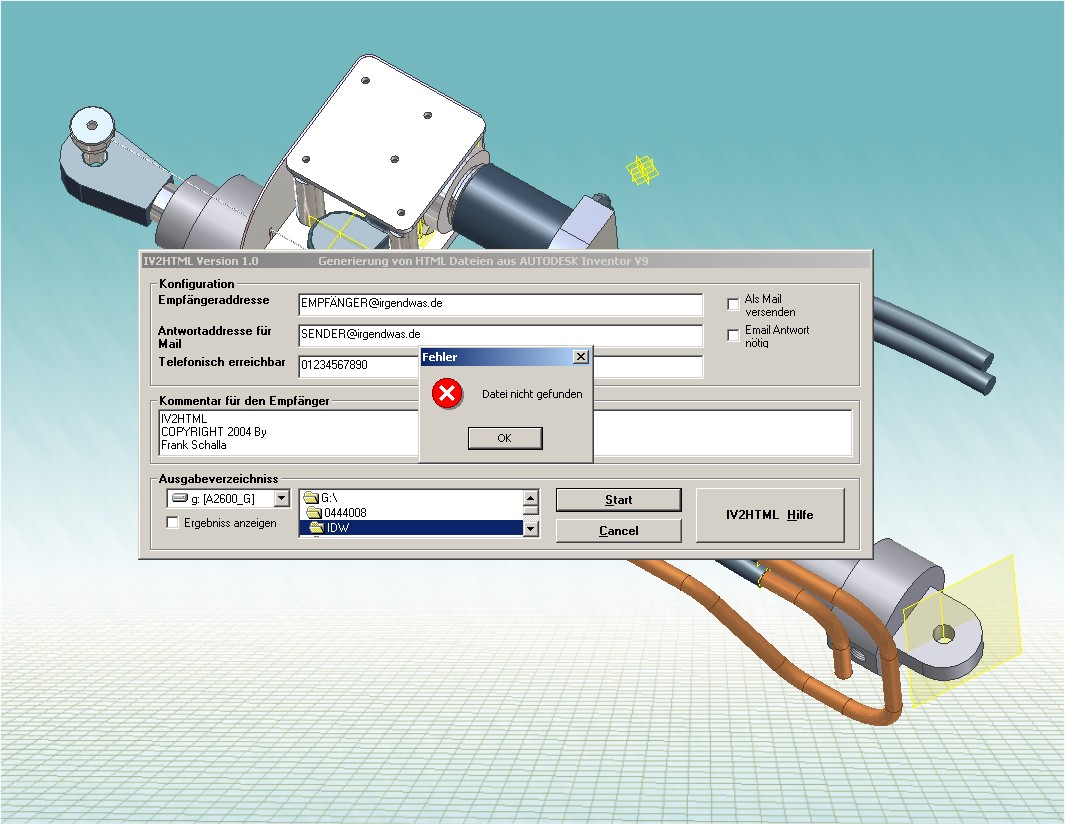 Nachdem IV2HTML inzwischen auch auf den Inventor Customer Files aufgetaucht ist, hab' ich mich nochmals damit beschäftigt. Bei mir klappt das nur eingeschränkt, wahrscheinlich läuft es nur in einem bestimmten Verzeichnis. Bei mir war es ein Unterverzeichnis von Laufwerk G:\. Da werden aber dann einige Dateien nicht gefunden. Aber die DWF-Dateien (2D und 3D) werden erstellt, jedoch ohne HTM. Und Franks 3D-Kran im Beispiel auf den Customer Files läßt sich bei mir auf dem Rechner wunderbar umherdrehen, mit der zugehörigen inhalt_3d.htm. Deshalb hab' ich die mal versuchsweise auf meine Webseite geschoben. http://www.holzwarth-cad.de/dwf/inhalt_3d.htm Und wenn man da nun umherdreht und anschließend mal den gelben Pfeil drückt, kracht's. Genau, wie hier beschrieben ..