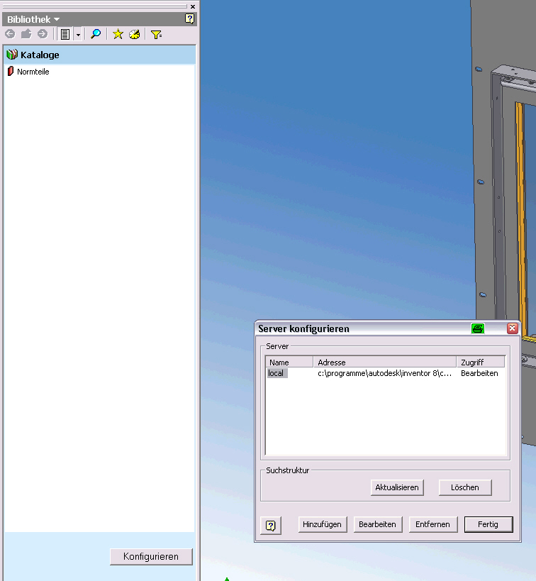 Hallo 00cad, Die Anwendungsoptinen liegen in der Regisrty unter: HKEY_CURRENT_USER\Software\Autodesk\Inventor\RegistryVersion9.0 die "eingefügten" Projekten (ich denke du meinst die Liste unter Datei > Projekte) sind Verknüpfung zu den IPJ Dateien die unter Anwendungsoptionen > Dateien > Projektordner definiert ist Was verstehst du unter "eingefügte Normteilbibliotheken"? ------------------ Grüsse Jürgen http://www.inventor-faq.de Dem Inventör ist nichts zu schwör  Eine Antwort auf diesen Beitrag verfassen (mit Zitat/Zitat des Beitrags) IP |