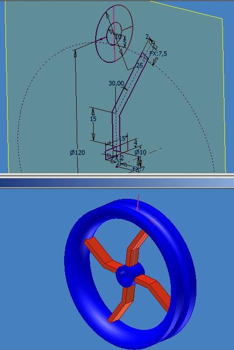 Hallo! Das geht ja richtig schnell mit den Antworten  Also ich versuche es noch einmal mit Worten. Wenns wieder nicht verständlich ist, werde ich heut abend mal die Datein uploaden... Problemstellung: Das äußere Ende der Speiche muss die gleichen Konturen wie der Kranz haben, damit diese praktisch ineinander gesteckt werden können. Die Speiche wird aber 30° geneigt eingebaut. Deshalb muss auch die Kontur in die Speiche 30° geneigt eingebracht werden. [Habe mal eine Zeichnung der Speiche ran gehangen] Diese 30° versetzte Kontur schaffe ich durch eine 2. Skizze und der Extrusion "Differenz".