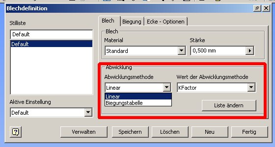 In den Blecheinstellungen (Blechdefinitionen) der IPT unter Abwicklungsmethode, entweder "linear" als K-Faktor ober als importierte Blechbiegetabelle. ------------------ Michael Puschner Autodesk Inventor Certified Expert Scholle und Partner GmbH [Diese Nachricht wurde von Michael Puschner am 07. Aug. 2006 editiert.] Eine Antwort auf diesen Beitrag verfassen (mit Zitat/Zitat des Beitrags) IP |