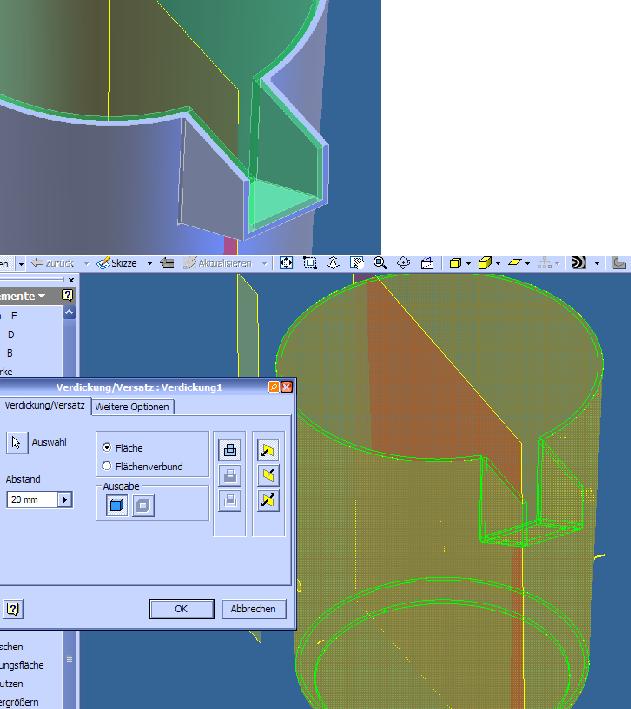 Hallo liebe Forenuser, dann werde ich mal versuchen Euch mein Problem zu erklären! Und zwar: Ich muss für einen Kunden eine Stahlgiesspfanne zeichnen! Ist soweit ja kein Problem, der Blechmantel der Pfanne und der Klimmbimm außen rum sind schon modelliert! (Anhang1) Und jetzt kommt der schwierige Teil: Die Pfanne ist innen mit Feuerfestmaterial ausgekleidet (2Schichten)! Da hab ich mir gedacht, ich kopiere die innere Fläche des Blechmantels, mache daraus ein neues Bauteil und verdicke diese Fläche auf die benötigte Auskleidungsstärke! Oder ich gehe direkt über Verdickung / Versatz, und dann neues Bauteil! Aber das habe ich mir auch nur so gedacht, leider macht mir der 11er INV da einen Strich durch die Rechnung! Über die Forensuche habe ich leider keinen Beitrag gefunden, der mir helfen konnte! Darum bitte ich Euch um Hilfe! Schonmal Danke im Vorraus! Grüße Patrick