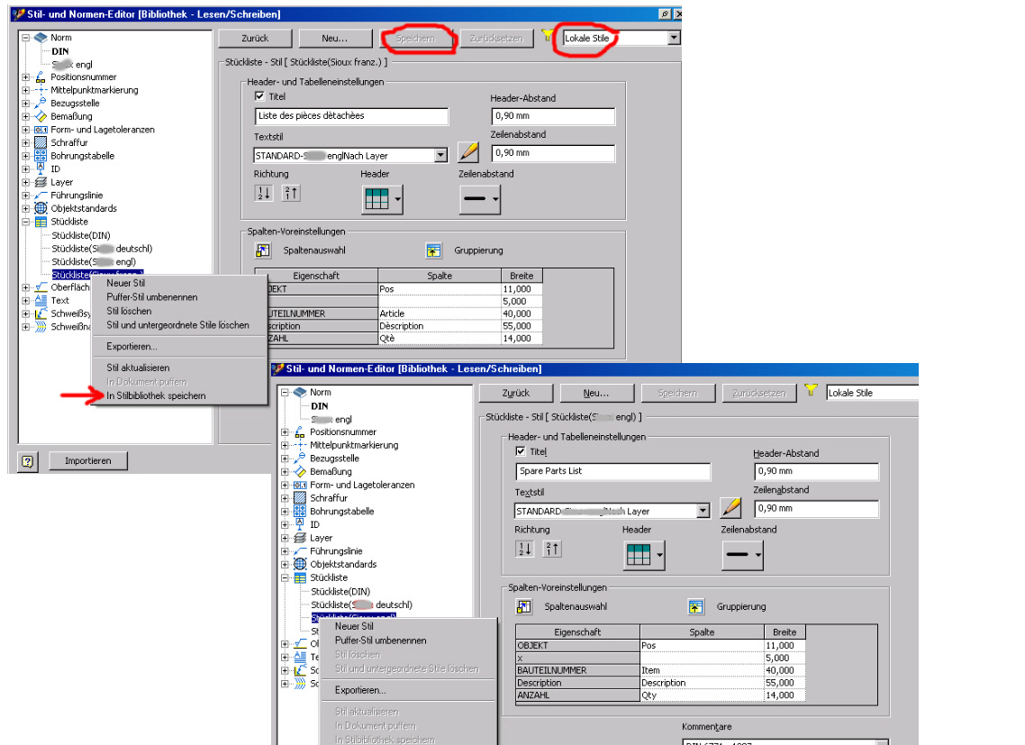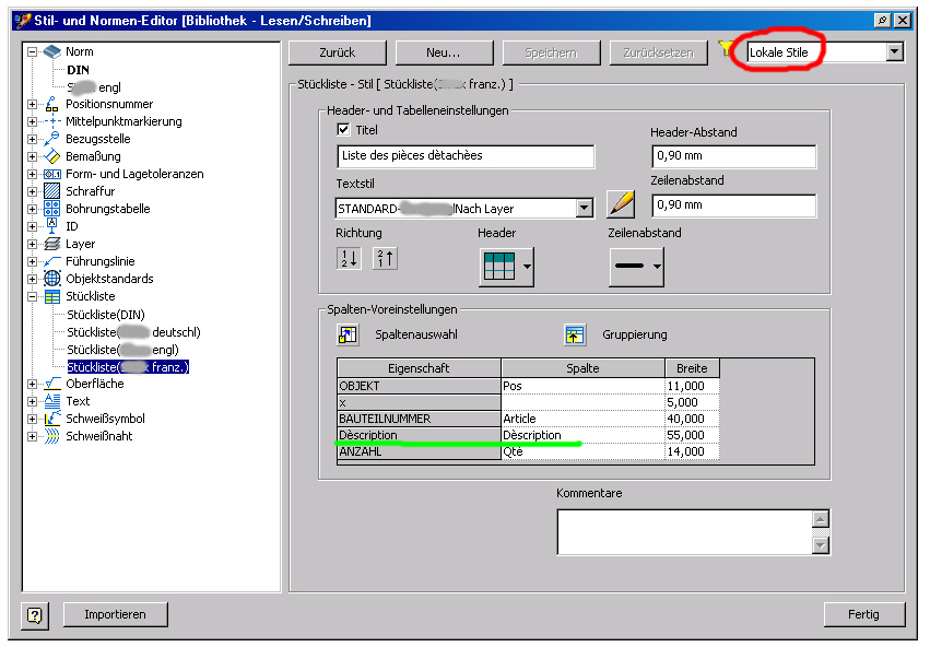 Hallo, ich habe schon gemerkt, mit den Stilen ist das so eine Sache....(Auch in IV10) Ich habe für verschiedene Sprachen Stüli´s zur Verfügung. Bei einer ist allerdings in der Spaltenbreite ein "Fehler". Die Spalte ist 75 statt 55. Ich habe bisher bei jeder "alten" IDW die Spalte korrieren müssen. Nun habe ich versucht, bei einer neuen IDW-Vorlage dies direkt auf 55 umstellen wollen. Es läßt sich die Änderung im Editor speichern und auch die Zeichnung als Vorlage speichern. Aber wenn ich die Neue aufrufe, habe ich immer die alte Einstellung drin. Auch eine doppelte Stüli für Deutsch ist drin und bleibt auch drin. Wie läßt sich denn die Spalte und die Doppelte endgültig ändern? Vielen Dank für die zahlreiche Hilfe, Erich Eine Antwort auf diesen Beitrag verfassen (mit Zitat/Zitat des Beitrags) IP |