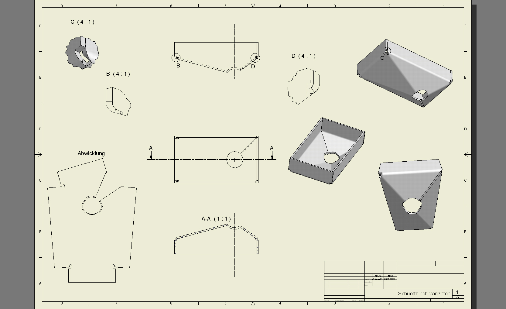 Guten Abend, evtl. kann mir ja jemand bei meinem Problem helfen. Zum Thema rund auf eckig gibt es ja schon einige Beiträge,aber Diese treffen nicht für meinen Fall zu - denke ich zu mindestens. Muss eine Art Trichter bauen 910x2740x4. Es soll aus technischen Gründen aus vier Teilen zusammen geschweißt werden. Nun mein "Problem". Die Rundungen sollen durch das Kanten von einzelnen Segmenten erstellt werden. Evtl. in Bild 2 zu erkennen. Das Model in Bild 1 habe ich mit Erhebung erstellt. Da werden die Ecken aber rund. Nun habe ich mir ein 3D Drahtgitter gebastelt und die einzelnen Segmente daraus extrudiert und so einen viertel Teil des Trichters erhalten. Bei dem Versuch abzuwickeln, egal ob mit dem Button oder in dem man die Flächen anklickt und dann abwickelt, stürtzt Inventor ab. Ich danke für alle nützlichen Hinweise Gruß Henry Eine Antwort auf diesen Beitrag verfassen (mit Zitat/Zitat des Beitrags) IP |