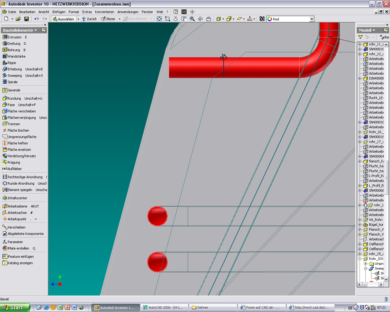Nee, kein Boykott, musste mich aber erst einmal in dieses Rohr hineindenken.     Zu Punkt 1 ist ja schon hinreichend viel geschrieben worden. Erst gestern gab es ja einen Thread der mit der Längenanpassung von Profilen in der BG zu tun hatte. Eine Lösung wäre, eine Arbeitsebene in der BG auf die Behälterfläche zu legen, das Rohr in der BG zu bearbeiten und die 3D-Skizze für das Rohrauf dieser Arbeitsebene enden zu lassen.  Zu 2. Habe dein Bauteil heruntergeladen und konnte das Rohr am fraglichen Ende verlängern oder verkürzen. Verkürzen natürlich nur bis zu dem Anfang des Bogens (33 mm); bei weiterer Verkürzung gab es eine Fehlermeldung, aber ohne Absturz. Andreas Eine Antwort auf diesen Beitrag verfassen (mit Zitat/Zitat des Beitrags) IP |