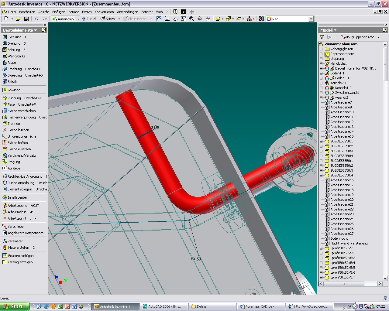 ... und wenn es keine Layoutskizze gibt, dann die Kontur des Behälters per abgeleitete Komponente ins Rohr holen (und zwar als Flächenelement) und darauf dann munter drauflosbeziehen.   Adaptivität ist nur für den Entwurf zulässig und muß gegen Ende der Konstruktionsphase abgedreht werden.   Wenn etwas sich immer anpassen soll, dann ist Adaptivität das falsche Werkzeug. Dann kommt einzig die abgeleitete Komponente zum Zug. ------------------lg