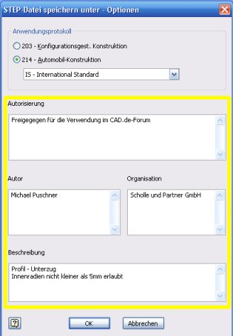 Doch, sie stehen im Header der STEP-Datei: Code: HEADER; /**************************************************************** * Generated by software with PDE/Lib inside * * PDElib Version v51a, created Thu 12/14/2006 * * International Technegroup Inc. (www.iti-oh.com) * ****************************************************************/ FILE_DESCRIPTION(('Profil - Unterzug','Innenradien nicht kleiner als 5mm erlaubt'),'2;1'); FILE_NAME('D:\\DATA\\Inventor\\Inventor2008\\CADde\\test.stp','2008-02-26T23:33:59',('Michael Puschner'),('Scholle und Partner GmbH'),'Autodesk Inventor 2008','Autodesk Inventor 2008','Freigegeben fuer die Verwendung im CAD.de-Forum'); FILE_SCHEMA(('AUTOMOTIVE_DESIGN { 1 0 10303 214 1 1 1 1 }')); ENDSEC;