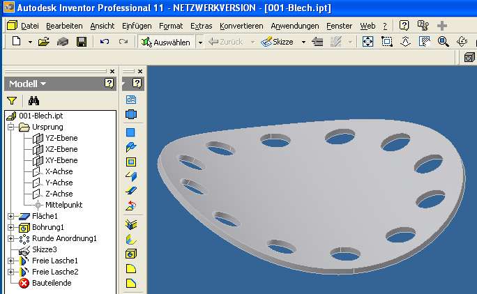 Zitat: Original erstellt von alienterhaken: Ich habe ein rundes Blech (Durchmesser 100mm) erzeugt und auf einem Teilkreis von 80mm mehrere Bohrungen eingebracht. Das Blech wurde dann mit dem Biegeradius 100mm (freie Lasche) gebogen.