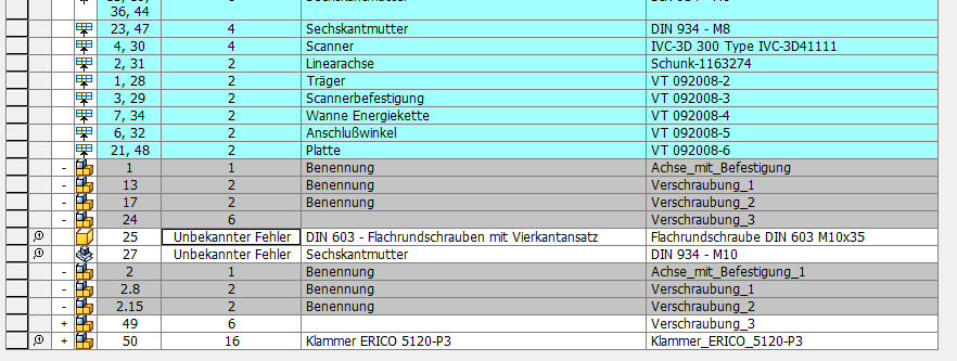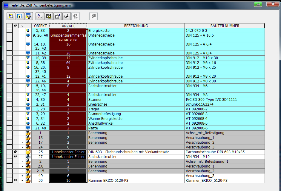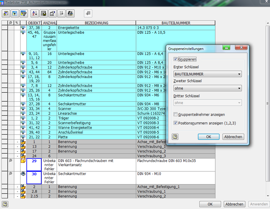 Zitat: Original erstellt von freierfall: Jetzt kommen wir der Sache Näher. Willst du die Positionen so haben? nicht unbedingt aber es geht ja nicht anders, oder?Nimm erst Mal diesen Haken bei Gruppieren raus. Erscheint dann der Fehler noch? Ja Schliesse nun die Teileliste. Gehe in den Browser und klappe das Blatt auf und RMT (rechte Maustaste) auf eine Ansicht. Dort Stückliste auswählen. Nun bist du in der Stückliste und kontrolierst ob die Elemente dort zusammengeführt werden. So wie es aussieht werden die Teile dort zusammengeführt! Wenn nein bitte mein obere Post durcharbeiten. Dann geht es auch.
