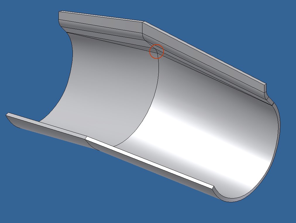 Naja, das geht schon. Deine Juckepunkte: - Die innere Stützkontur ist nicht gut. Es gibt da am roten Kreis einen Einfall, der ungünstig ist. Ich habe das etwas nach außen gezogen - Man sollte sowas komplett aufdicken. Das geht aber nur mit Übergangsradien zwischen den Flächen - Durch das Verdicken hast Du in der Mitte keine ebene Fläche mehr. Ich habe da mit der Trennfunktion etwas nachgeschnibbelt Tja, und dann kannste spiegeln. Option ganzes Bauteil [Diese Nachricht wurde von W. Holzwarth am 04. Dez. 2008 editiert.] Eine Antwort auf diesen Beitrag verfassen (mit Zitat/Zitat des Beitrags) IP |
