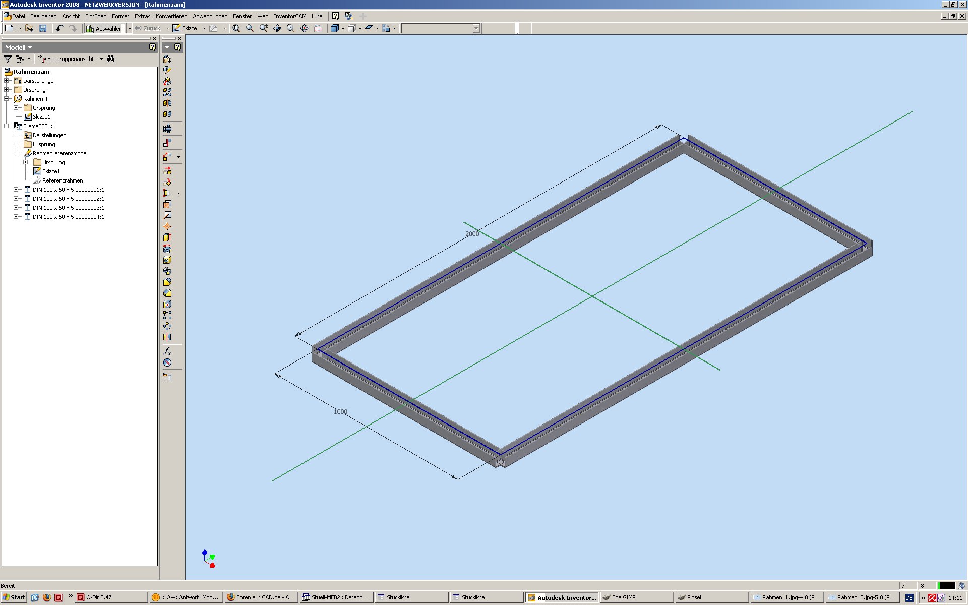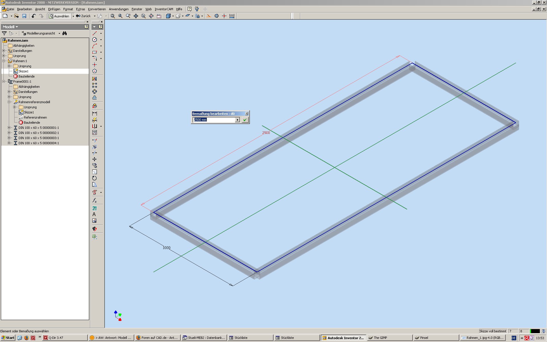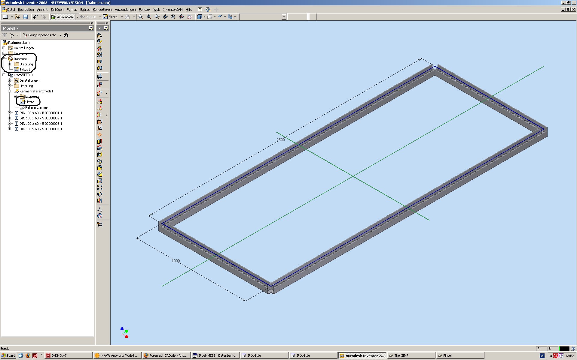 okay habe gerade an deinen bildern festgestellt das man, um die skizze bearbeiten zu können, den rahmen in einer .iam erstellen muss und erst in einer anderen baugruppe laden muss....dann ist das jetzt auch klar warum ich nie die skizze aufrufen konnte!!! habe jetzt zw<r alles in einer baugruppe aber denke mal da muss ich jetzt durch:P  danke das hat mir echt geholfen Eine Antwort auf diesen Beitrag verfassen (mit Zitat/Zitat des Beitrags) IP |