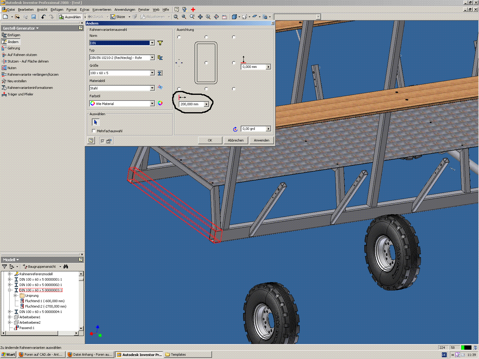 ok, hab verstanden. meiner Auffassung nach ist das aber nicht die beste Vorgehensweise, das Gestell zu ändern. du solltest schon die Skizze bzw. Definition (Modell) zu diesem Rahmen ändern. Die zugehörige Skizze siehst du unter Referenzmodell, in deiner Rahmenbaugruppe. Diese wird aus einem anderen Modell erzeugt, und muß in diesem auch geändert werden, danach ändert sich auch dein Rahmen. Meines Erachtens sollte dieses "Grundmodell" auch immer in der Baugruppe platziert sein, da sonst die Bearbeitung des Rahmen schwierig wird. Schau dazu mal in die angehängten Bilder. Ich hoffe die erklären mehr als meine wirren Worte. Eine Antwort auf diesen Beitrag verfassen (mit Zitat/Zitat des Beitrags) IP |