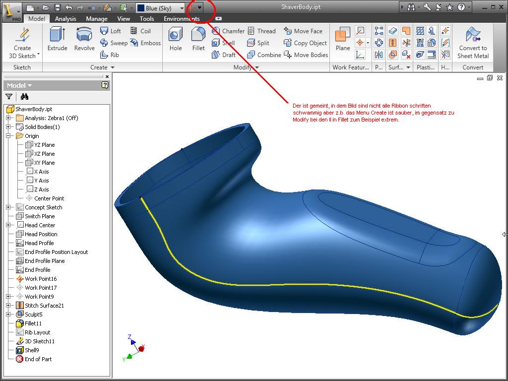 Hi, hab mir mal erlaubt deinen Anhnag zu benutzen. Bei mir am PC (Monitor) ist das allerdings auch nicht, wenn ich die Ribbons an habe. Ist den nur die Schrift in der Ribbonleiste so Schwammig oder auch die der Befehlsfenster wenn die Ribbons an sind. Zudem müßten die Befehle doch bekannt sein und wie die Gruppen heißen ist auch egal einfach ohne Text anzeigen lassen. Klick auf den kleinen Pfeil... zweites Bild von hier http://www.hagerman.com/Products/2010/Images/Inventor%202010%20Mo lded%20Part%20Definition%20Screen%20Shot.jpg MfG MacFly ------------------ - - - der Erleuchtung ist es egal wie du Sie erlangst - - - - - - Wir leben alle unter demselben Himmel, aber wir haben nicht alle denselben Horizont - - - (K. Adenauer) [Diese Nachricht wurde von MacFly8 am 02. Okt. 2009 editiert.] [Diese Nachricht wurde von MacFly8 am 02. Okt. 2009 editiert.] Eine Antwort auf diesen Beitrag verfassen (mit Zitat/Zitat des Beitrags) IP |