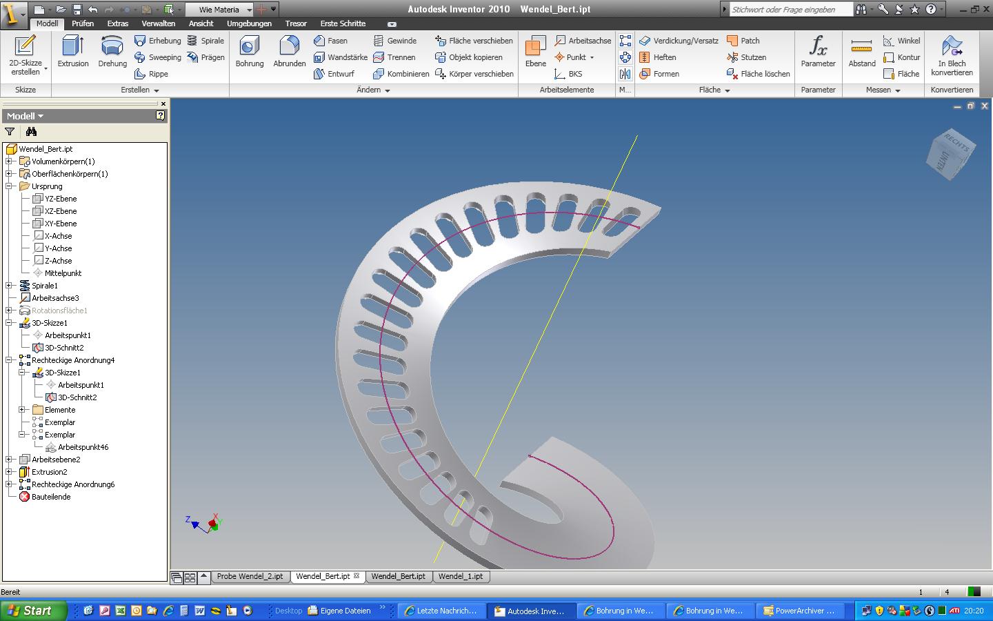 Du kannst ja mehrere Anordnugen machen: 1. Anordnung mit 2 Elemente und 2. Anordnung mit 5 Elemente. Weiters solltest du beim erstellen des 3D-Pfades nicht das ganze Bauteil auswählen sondern nur die obere Fläche. Beim erzeugen der Spirale benötigst du die erstellte achse nicht. Nimm statdessen eine Ursprungs-Achse. Eine Antwort auf diesen Beitrag verfassen (mit Zitat/Zitat des Beitrags) IP |