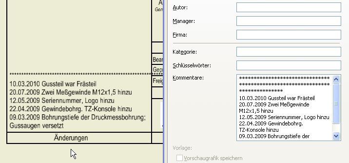 Das wiederum weist auf eine neu hinzugekommene oder aus Versehen anders eingestellte Option hin. Ich würde mit den zahlreichen Optionen für den Text experimentieren, die da oben in der Dialogbox sind, oder auch in den Stilen. Wie gesagt, bei uns geht es auch in IV 2010, und wir haben auch grad von IV 2009 umgestellt. Im Übrigen benutzen wir den automatischen Umbruch aber auch kaum. Der Lesbarkeit halber würde ich bei einem mehr als einzeiligen Eintrag immer die weiteren Zeilen einrücken, und das leistet der automatische Umbruch nun mal nicht. Am Besten ist, mit einer Zeile auszukommen. Wir setzen daher den Änderungskommentar ohne Kasten über das Schriftfeld und haben so genug Platz nach rechts. [/QUOTE] Gut - dann liegt es schonmal nicht am Versionswechsel. Und klar, ich versuchs ja mit nur einer Zeile. Und lieber hab ich alles im Ä.-kommentar drin zu stehen, als das ich einem gepflegten Layoutstil fröhne und manuell einrücke. Ein Zeile Änderungskommentar über die ganze Breite des Schriftkopfes wäre am besten aber dafür müsste der eeeh hoffnungslos veraltete Schriftkopf umgestrickt werden und das lässt mein Zeitbudget momentan nicht zu.