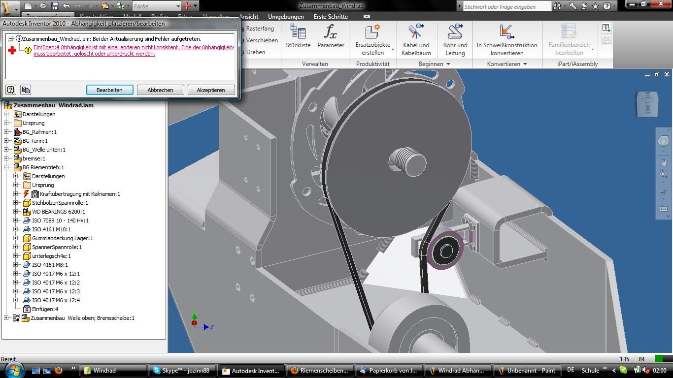 Hallo Johannes, die Achsabstände der Wellen in Deiner Hauptbaugruppe und der Scheiben in der Riementrieb-Baugruppe müssen exakt übereinstimmen. Abweichungen von 1µm (oder weniger) reichen schon, dass der Inventor meckert. Ulrich Eine Antwort auf diesen Beitrag verfassen (mit Zitat/Zitat des Beitrags) IP |