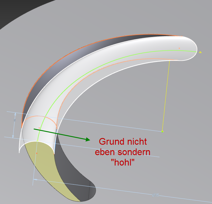 Marguuus, wenn Deine Sys-Info ausgefüllt wäre, könnte ich sagen, ob Du mit dem Dateianhang etwas anfangen kannst. Anhang als IV 2011 Ich habe den runden Grund Deiner Fräsung mit Hilfe einer Spirale als Führungslinie als Fläche gesweept, die Wangen angepappt und dann die Flächen geheftet. Ergebnis (nach meiner Meinung wie im richtigen Leben) eine Ausfahrspur mit einem hohlen Grund. Gruß, Bernhard