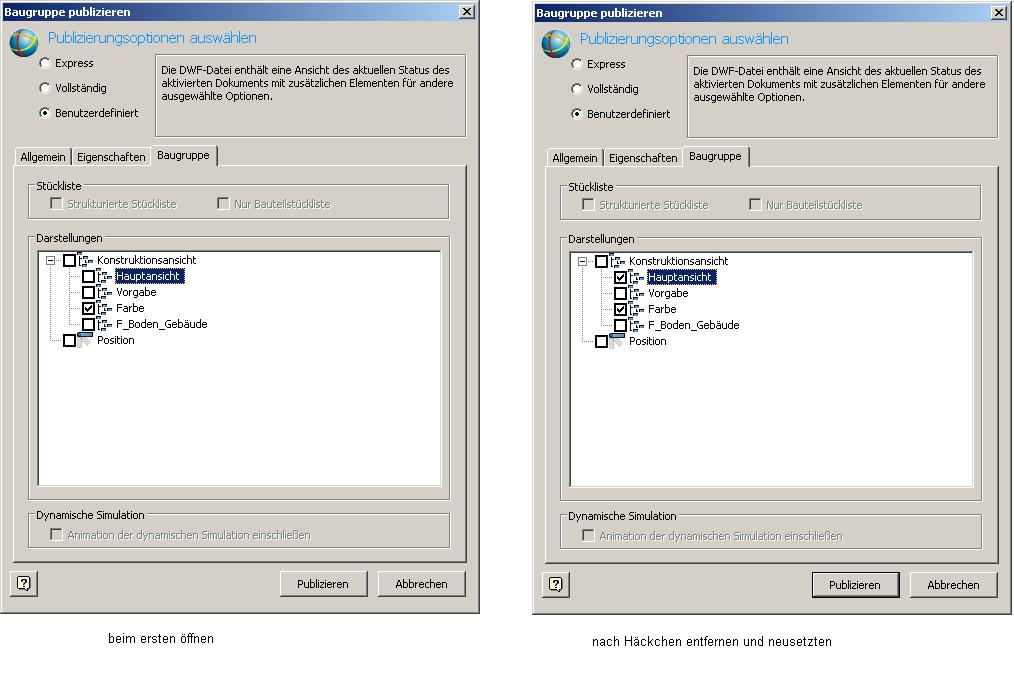 Hi, ich denke du meinst angehängten Fehler. Den hatten wir auch schon des öfteren, bekomme den nur weg indem ich die Hauptansicht der Baugruppe aktiviere, dann auf alles neu erstellen klicke und anschließend speichere. Ist wohl irgendwas dirty in deiner Hauptansicht. und da die im DWF immer mit Exportiert wird knallt es halt da bei dir. Kannst ja mal in den Publizierungsoptionen unter dem Reiter Baugruppe mit den Häkchen vor den Ansichtsdarstellungen spielen. Voreingestellt beim öffnen bei mir ist die letzte Aktive Ansichtsdarstellung und sonst nichts. Nimm das Häkchen mal raus und setzt es neu bei mir wird dann Automatisch die Hauptansicht mit angehackt. Mfg MacFly ------------------ - - - der Erleuchtung ist es egal wie du Sie erlangst - - - - - - Wir leben alle unter demselben Himmel, aber wir haben nicht alle denselben Horizont - - - (K. Adenauer) [Diese Nachricht wurde von MacFly8 am 28. Okt. 2010 editiert.] Eine Antwort auf diesen Beitrag verfassen (mit Zitat/Zitat des Beitrags) IP |