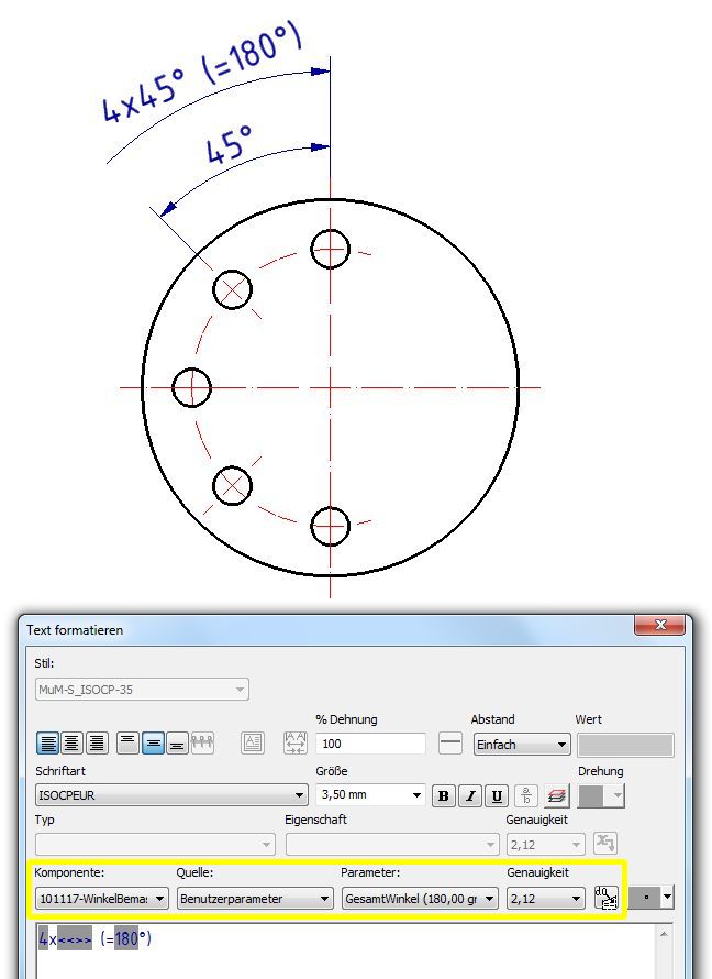 Willkommen bei CAD.DE und AUGCE! Vier wichtige Links für den problemlosen Einstieg: Richtig Fragen - Nettiquette - Suchfunktion - System-Info An welcher Stelle scheitert dieses Unterfangen denn? Mittellinien als konzentrische Anordnung wurden hinzugefügt, oder automatisch erzeugt? Den Bemaßungstext kann man bearbeiten und hierbei sogar auf die Parameter des Bauteil zugreifne, damit die 4x45° auch bei Änderungen angepasst werden. Oder liegt es an dem Sonderfall des Winkels von 180°? ------------------ Michael Puschner Autodesk Inventor Certified Expert Mensch und Maschine Scholle GmbH