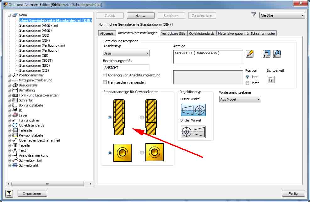 Mir fallen dazu zwei Lösungsmöglichkeiten ein: 1. Die Welle erst gar nicht schneiden, dann deckt sie verdeckte Linien ab. Insb. das Bild von Uwe zu Beginn des Threads zeigt eine Vollwelle, die sowieso nicht geschnitten werden sollte. 2. Im Stileditor die Gewindedarstellung verändern (siehe Bild). Das ändert zwar nicht die lustigen "Schraffurdurchdringungen", wenn beide Gewindeteile geschnitten sind, aber in der Regel kann man das m.E. verschmerzen. ------------------ Grüße Jörgen Eine Antwort auf diesen Beitrag verfassen (mit Zitat/Zitat des Beitrags) IP |